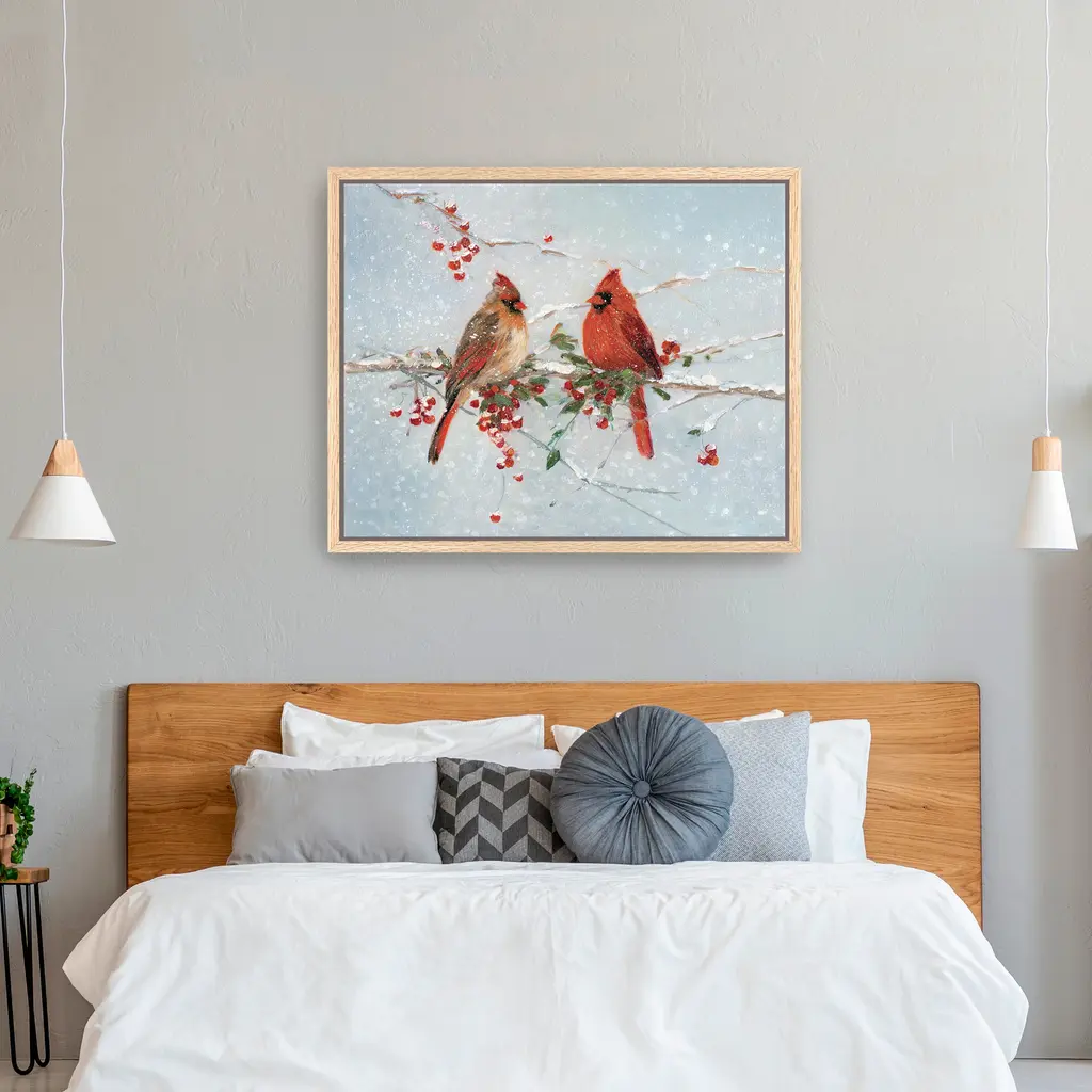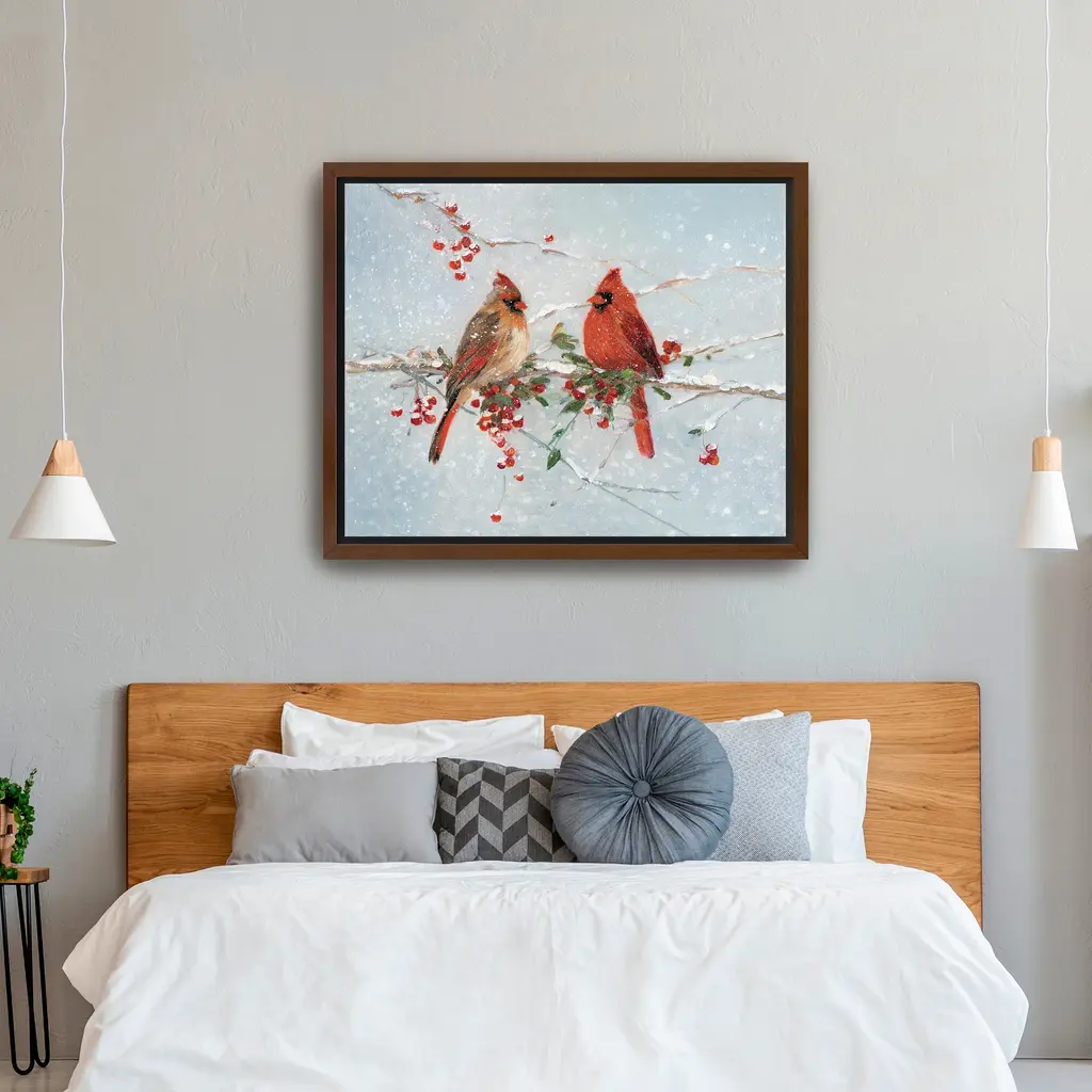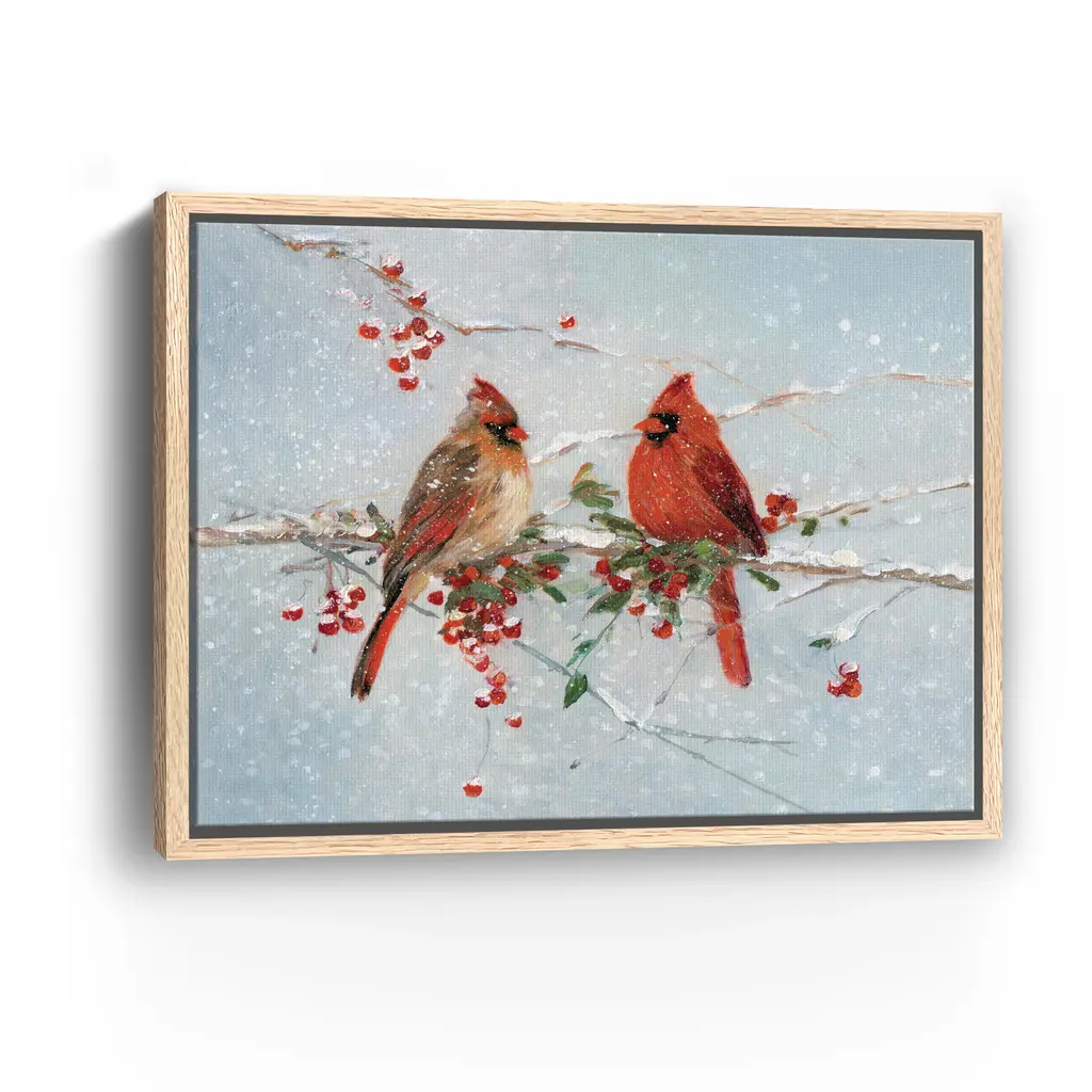Capture the quiet beauty of winter with this peaceful canvas print featuring delicate birds perched on snowy branches. The soft hues and vibrant red berries create a serene focal point perfect for seasonal decorating. Our Gallery Wrap Canvas Prints are proudly assembled with high quality materials in California, USA. Each piece is printed on a thick, archival grade canvas using Giclee technology. It is then hand-stretched by our experienced artisans over solid wood bars, which will not warp over time. The final product is a piece personally crafted for you to confidently display on your wall. Care and Assembly: Ensure that the location of your piece has little to no exposure to heat, sunlight, and moisture. Wipe clean, only if needed. Each piece includes hanging hardware to hang on your wall horizontally.