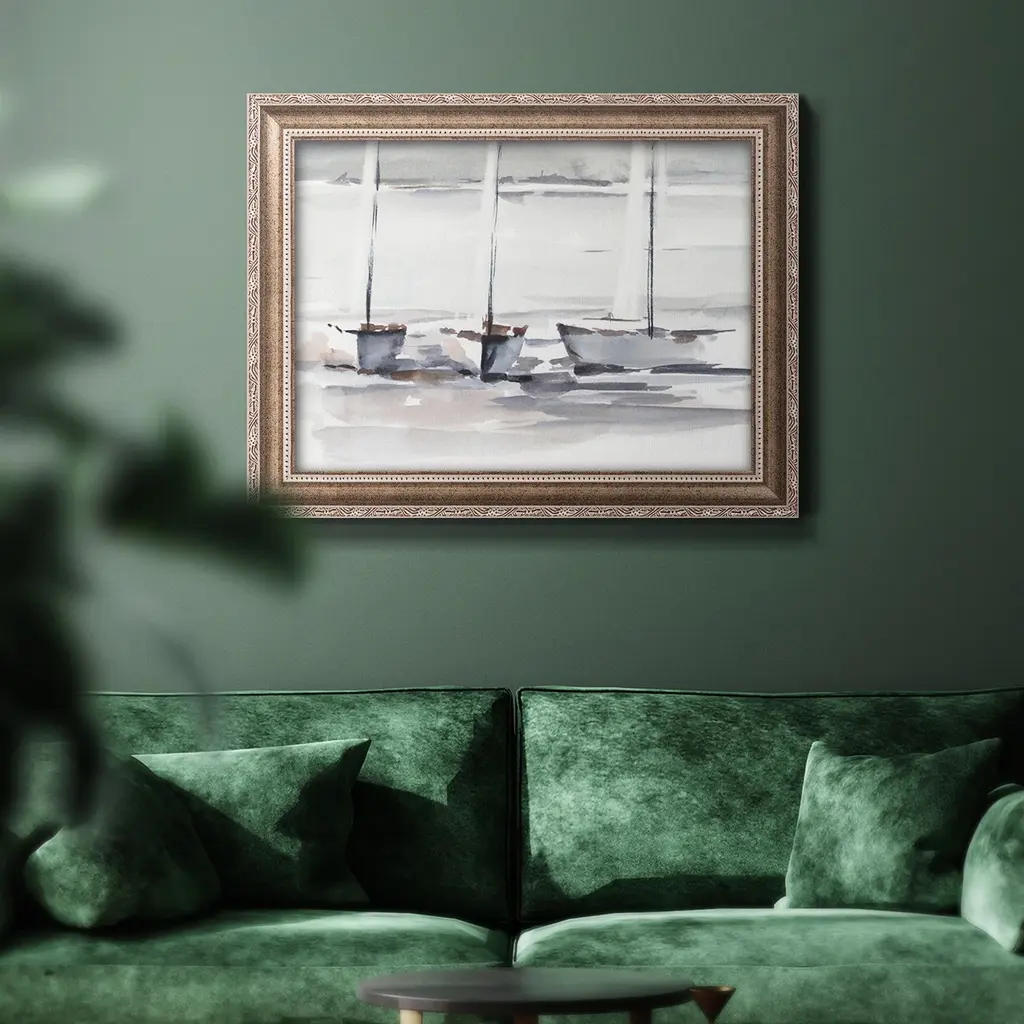 Caribbean Sails I Premium Framed Canvas- Ready to Hang A Premium Framed Canvas created to last. Framed in distressed wood and available in an array of sizes and colors Featuring a beveled a solid wood stretcher bar, each piece comes ready to hand 3 SIZES AVAILABLE 16''X20'' - Overall Size 18'X27'' - Overall Size 24''x36'' - Overall Size Each piece is made to order. Each piece comes with hanging hardware. Made in the USA Ready to Hang Giclee Paper Print Acrylic Glass Beveled Matt Board