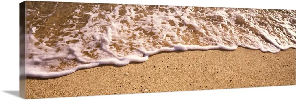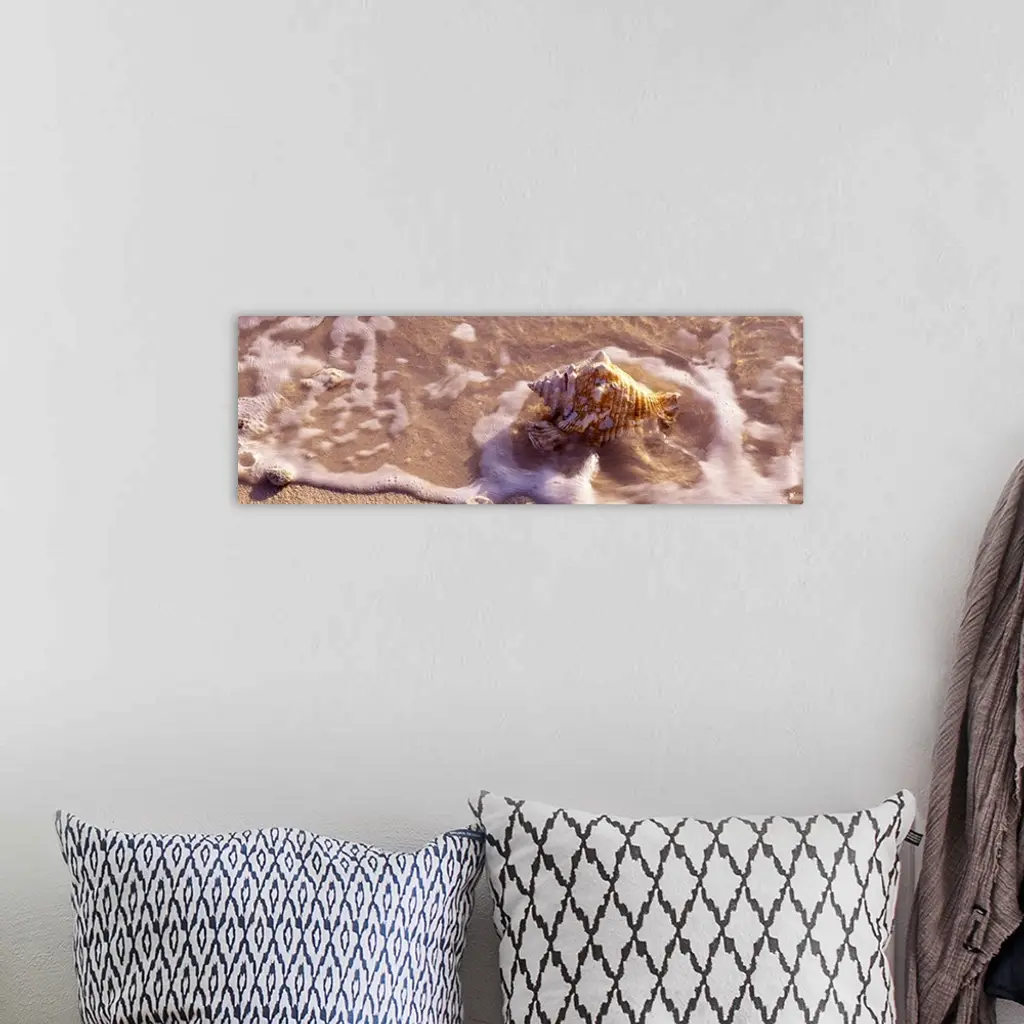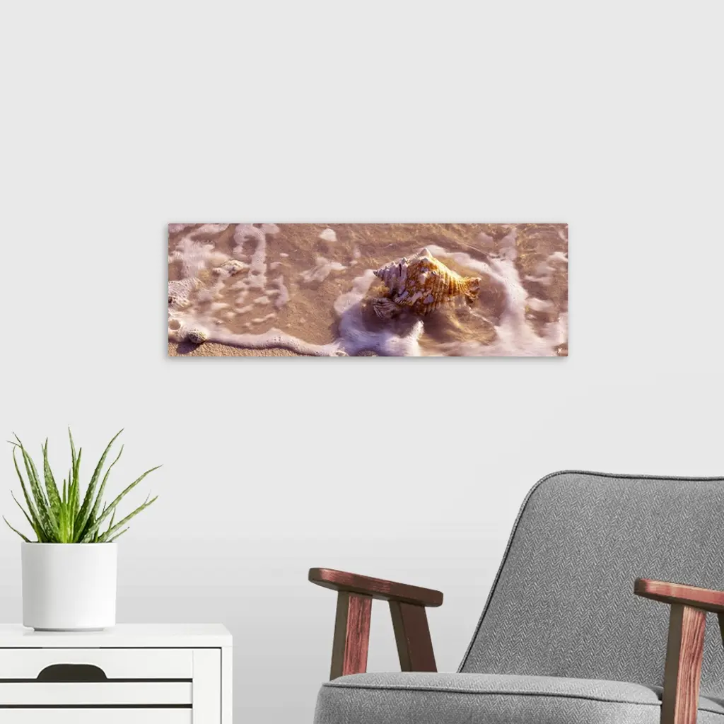 Long panoramic artwork of a sea shell on the beach with water hitting it.