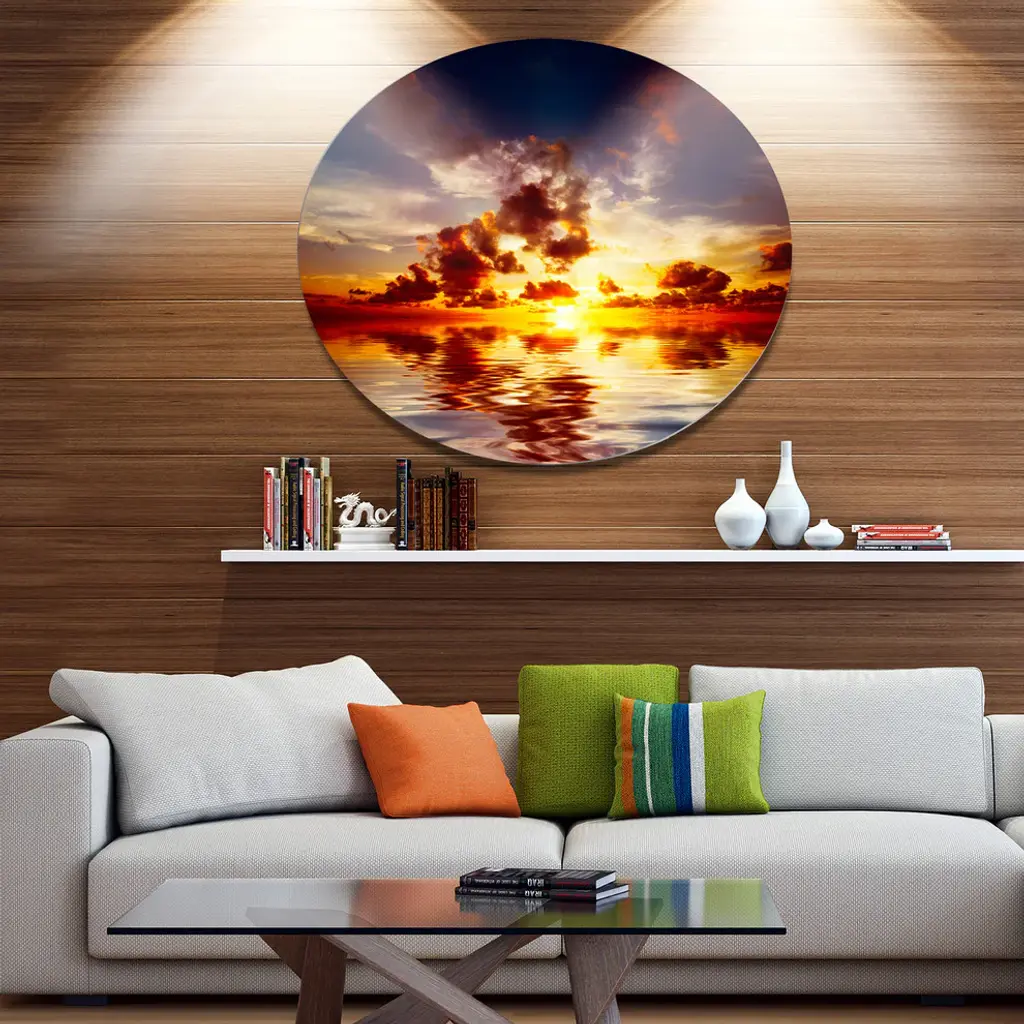 Bring Contemporary Abstraction to your home with this large Circle Metal wall art. This Caribbean Sunset with Beautiful Sky Metal Artwork makes it the focal point of any room or office. - White Gloss Coating ensures colors are extra vibrant with light reflection.- Aluminum grade Sheet Metal with 1 inch mounting frame on the back giving the illusion that the artwork is floating on the wall..- Mounting Brackets are included along with instructions.- High Quality Digital images are created directly into a glossy aluminum panel producing a stunning and captivating print into the glossy finish of the metal.- Water, Fire and Scratch resistant HD Aluminum panels.- Looks better than any photo paper and guaranteed to last at least 20 years- Easy to clean with a microfiber cloth. Colors are far superior to regular Canvas Art. - Easy to Hang