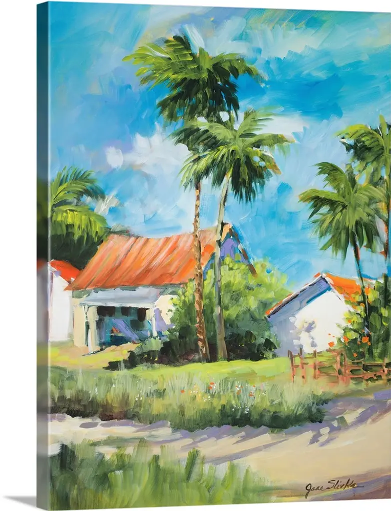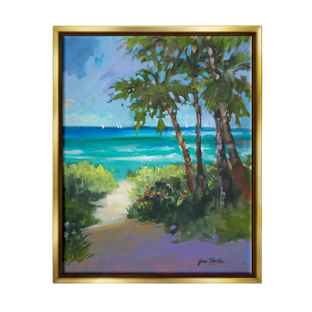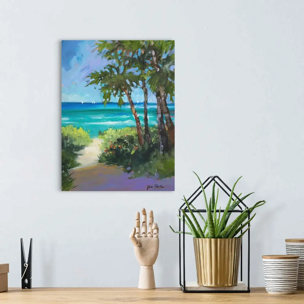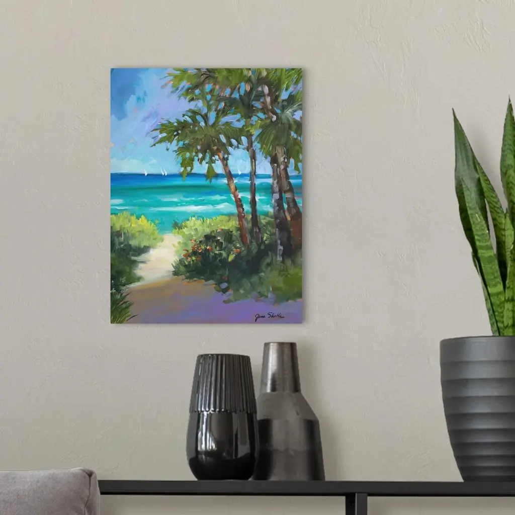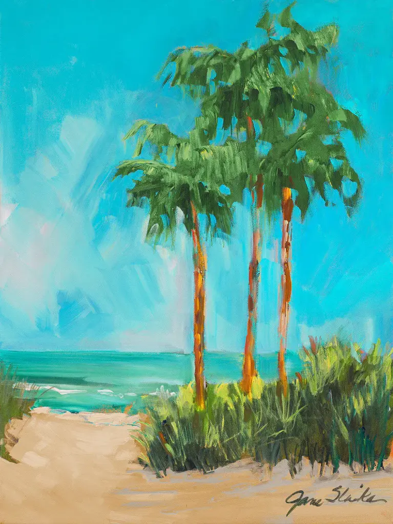 Contemporary artwork of a group of palm trees by a sandy path leading to the ocean.