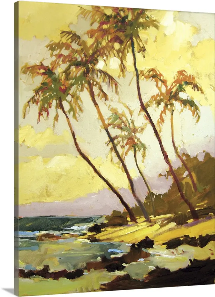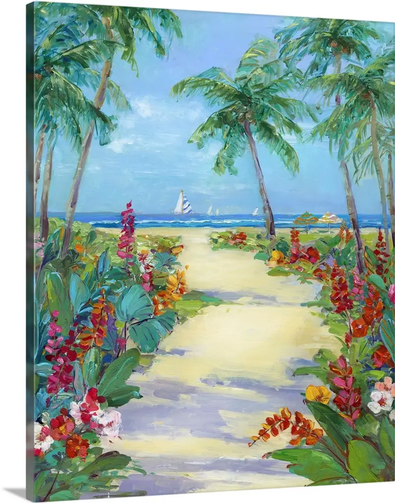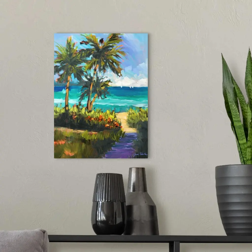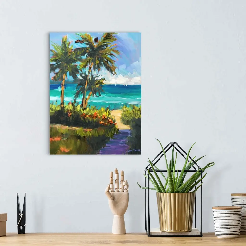 Contemporary artwork of a group of palm trees by a sandy path leading to the ocean.
