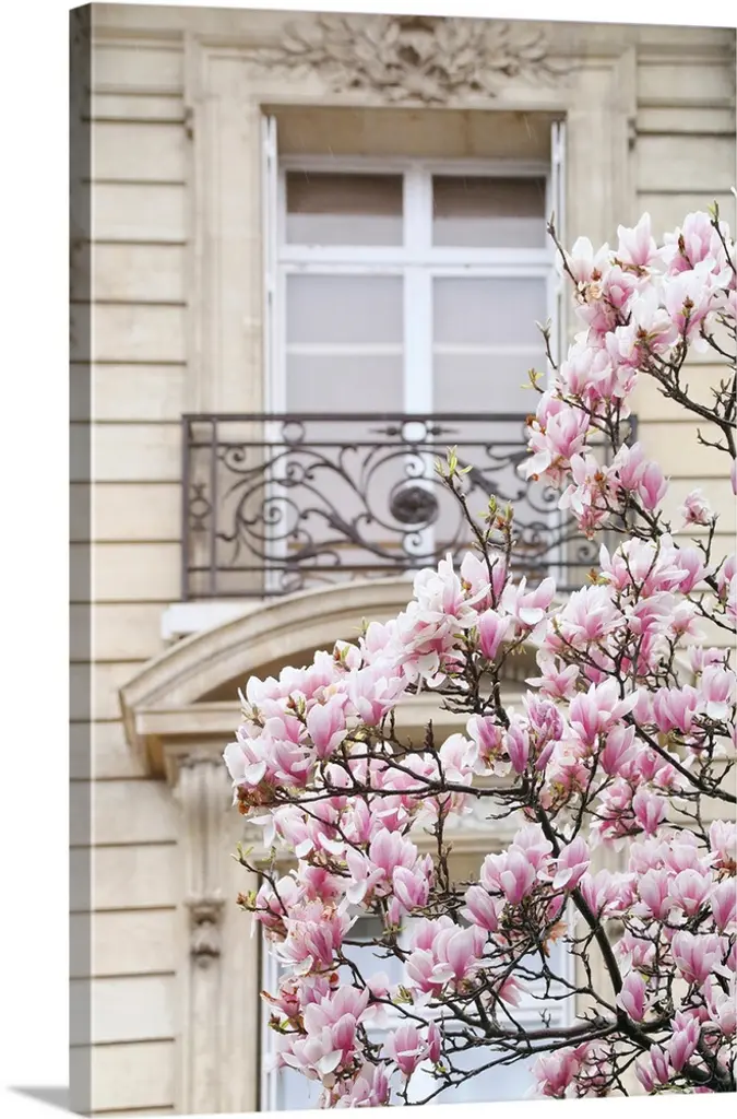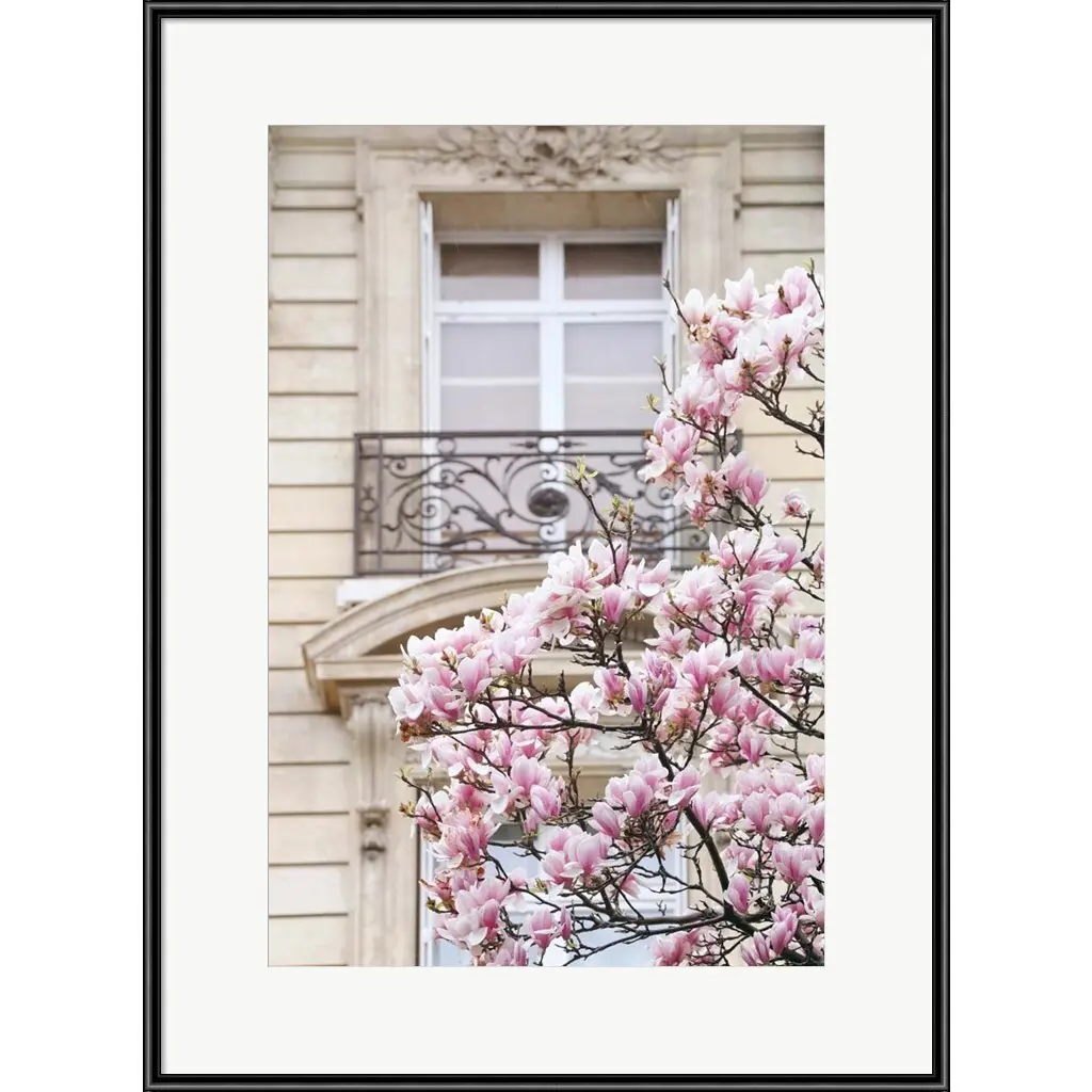 Spring Magnolias in Paris by Carina Okula is a high quality piece of framed artwork. The finished size of this piece is 17" X 23". It has a Metallic Thin Black frame, is single matted and finished with high quality Acrylic Plexiglass. 100% Satisfaction Guaranteed.