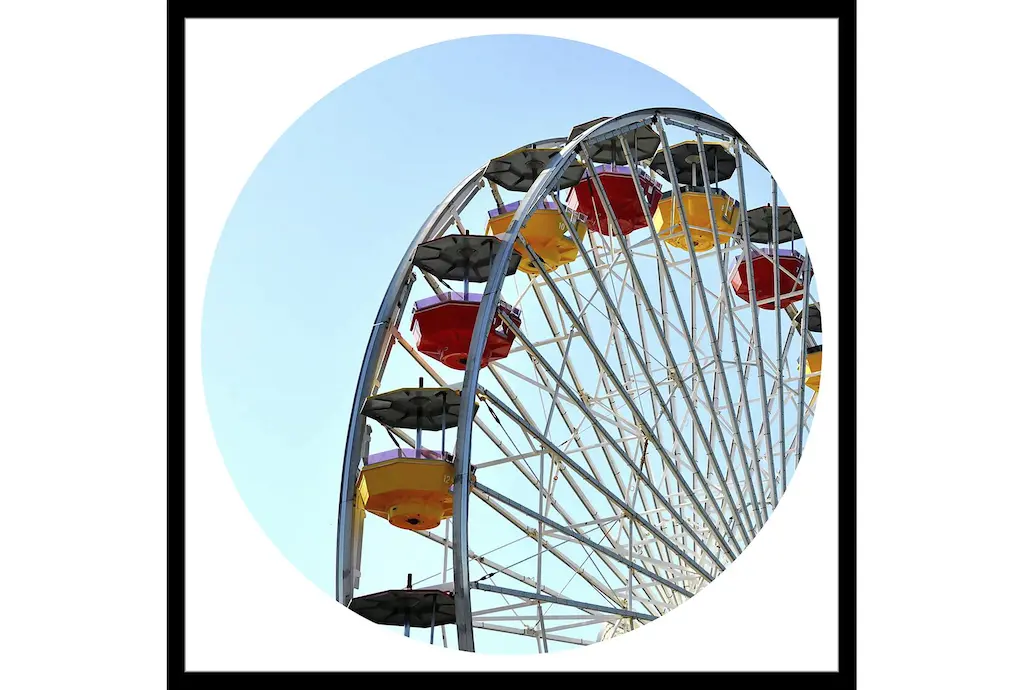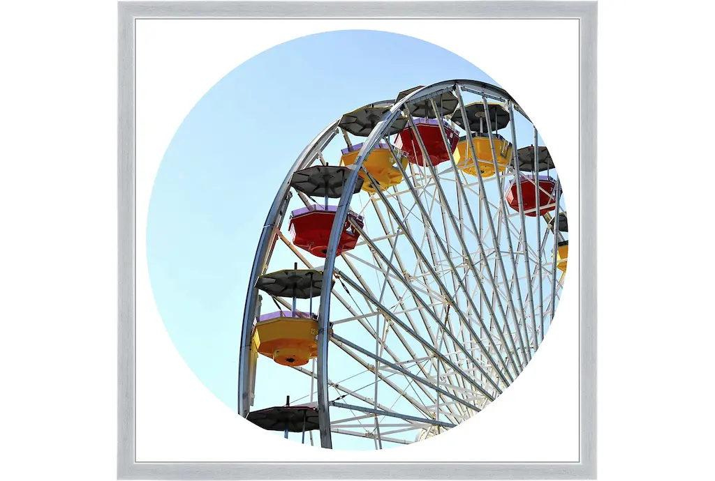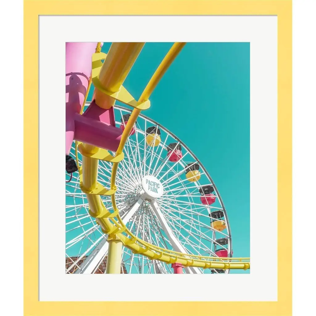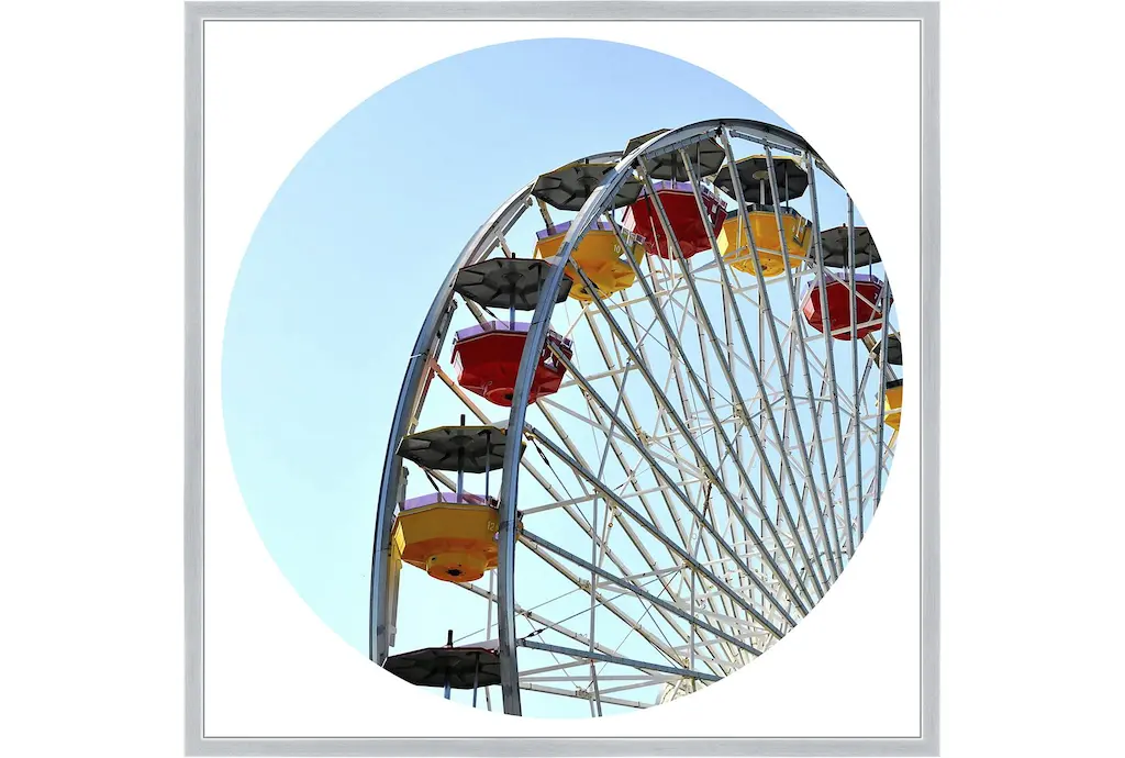 Pacific Wheel II by Carlos Vargas is a high quality piece of framed artwork. The finished size of this piece is 18" X 21.5". It has a Thin Yellow with Satin Finish frame, is single matted and finished with high quality Acrylic Plexiglass. 100% Satisfaction Guaranteed.