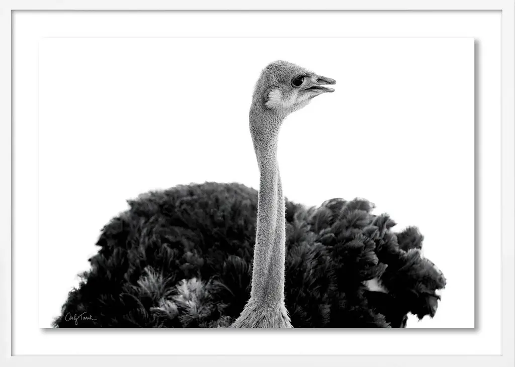 It's not often that we can get up close and personal with an ostrich. But photographer Carly Tabak did, and now you can too, with this black-and-white photograph. It arrives framed and ready to hang.Following a lifelong passion for photography, Carly Tabak has become an acclaimed landscape photographer. Based in the San Francisco Bay Area and an avid explorer, Carly creates photographs that embody the elements and energy of her unique experiences.