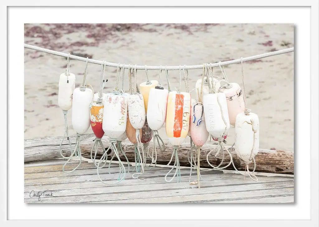 Carly Tabak's photograph of buoys hanging on a line evokes the sound of gulls soaring over the waves and the scent of salt-kissed breezes. The image arrives framed and ready to hang.Following a lifelong passion for photography, Carly Tabak has become an acclaimed landscape photographer. Based in the San Francisco Bay Area and an avid explorer, Carly creates photographs that embody the elements and energy of her unique experiences.
