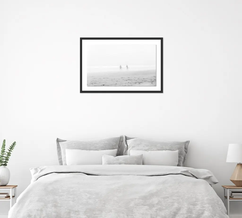 Carly Tabak's photograph of two surfers walking toward the waves amid a silvery fog makes a serenely beautiful addition to a bedroom, a living area, or almost any other room. It arrives framed and ready to hang.Following a lifelong passion for photography, Carly Tabak has become an established and acclaimed landscape photographer. Based in the San Francisco Bay Area, Carly's work is travel inspired. Her photographs embody the elements and energy from where they are sourced. As an avid explorer, each piece of Carly's collection is derived from her unique experiences. Carly's mission is to create warm, inviting, versatile works of art to complement and beautify any space in your home.