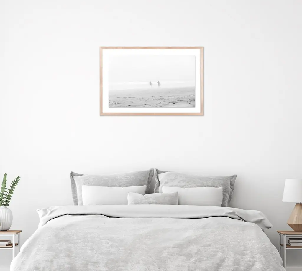 Carly Tabak's photograph of two surfers walking toward the waves amid a silvery fog makes a serenely beautiful addition to a bedroom, a living area, or almost any other room. It arrives framed and ready to hang.Following a lifelong passion for photography, Carly Tabak has become an established and acclaimed landscape photographer. Based in the San Francisco Bay Area, Carly's work is travel inspired. Her photographs embody the elements and energy from where they are sourced. As an avid explorer, each piece of Carly's collection is derived from her unique experiences. Carly's mission is to create warm, inviting, versatile works of art to complement and beautify any space in your home.
