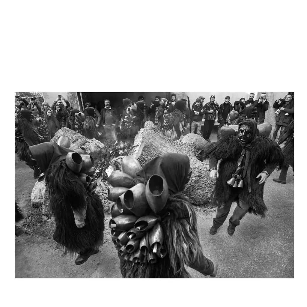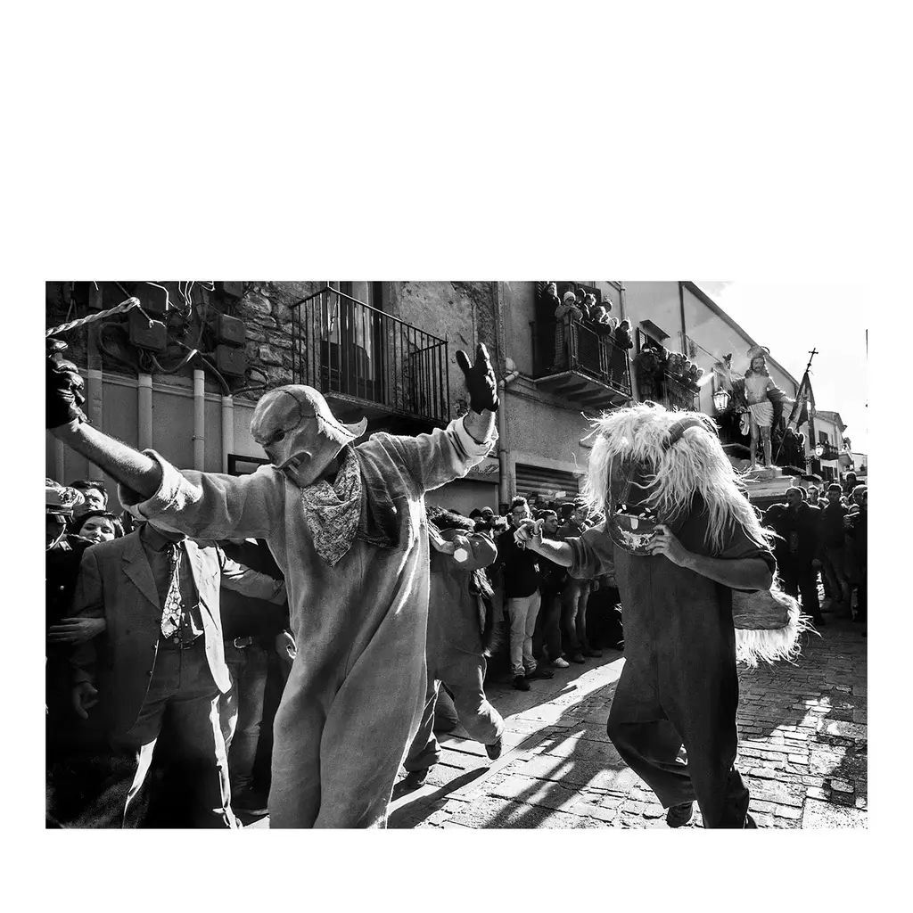 A man captured while having the bells of his traditional Mamuthone costume steadily fastened to his back is the striking subject of this photograph. The picture belongs to a series of ten all shot during the carnival with ancient pagan masked characters taking place in Mamoiada, Sardinia since the nuraghic era. Consult the Concierge for size variants. Frame is not included.