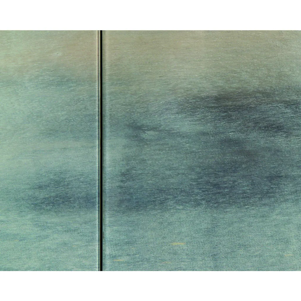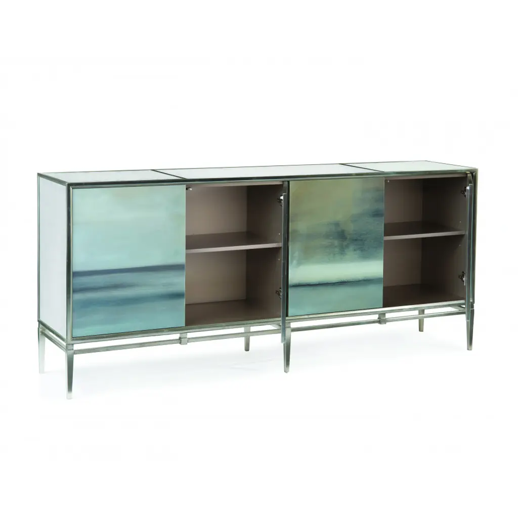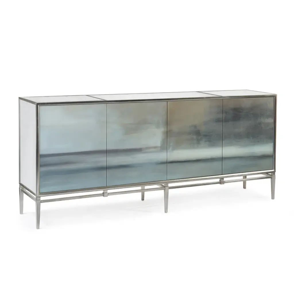 Slated, a stunning painting by esteemed abstract artist Carol Benson-Cobb, is featured on the door fronts of this credenza. The cabinet sits on a steel base with tapered legs finished in silver. The moldings surrounding the églomisé
