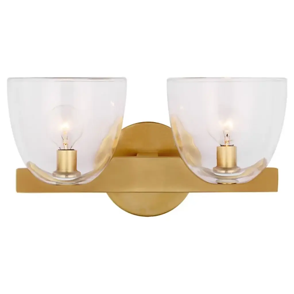 The Carola Vanity Light from Visual Comfort Signature, formerly known as Visual Comfort, provides an effortless modern appeal to its surroundings. Ideal for mounting over a bathroom mirror and small enough to position in hallway spaces without overpowering them, it starts with a sleek, circular wall plate that sends out a blocky central connector to support a robust horizontal crossbar. The fixture’s rounded theme continues as the otherwise flat bar features curved scoops cut out of its upper surface to seat damp-listed lamping inside clear glass goblet shades that bloom around them. The metalwork cut in coherence with the shades provides a lively, cohesive look, while the shades reduce bright glare to the sides, transforming it into a pleasing glow while projecting a focused uplight above the fixture.