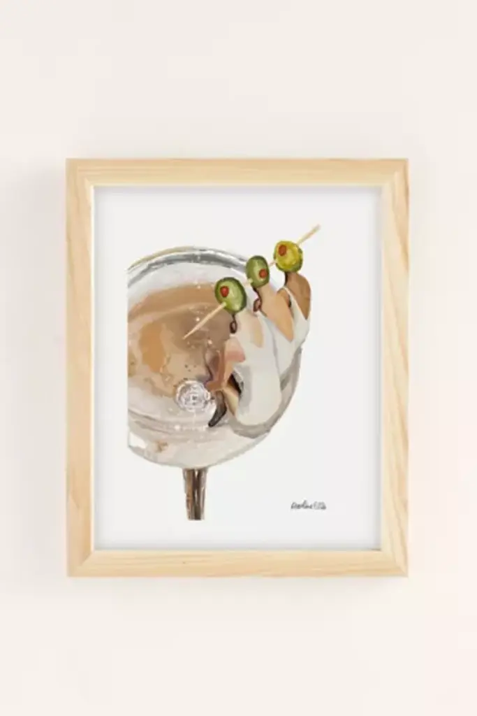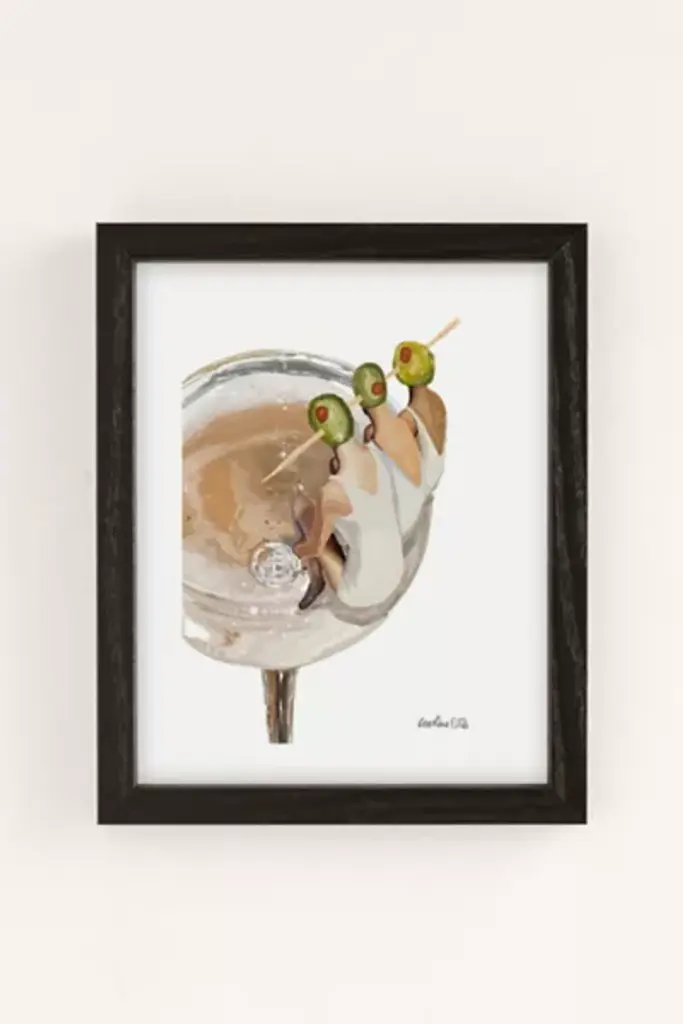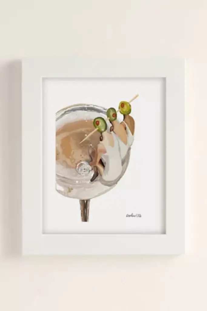 Art print by Caroline Ellis Art featuring olive figures lounging at the rim of a martini glass. Printed on archival paper made from cotton pressed in Italian mills, this high-quality art print is available in sizes and frames just right for your space. First select your frame (or go frameless), then select your size. **About the Frames** \- The exact width of each frame may vary slightly \- All frames are manufactured in the US \- Matte frames are durable poly \- Wood frames are recycled wood \- All are fitted with protective plexiglass \- Finished with wood moldings, archival backer and protective bumpers **Size** \- Available in multiple sizes \- Use the Size Guides to find the size that fits your space **Content + Care** \- Wipe clean \- Made in the USA
