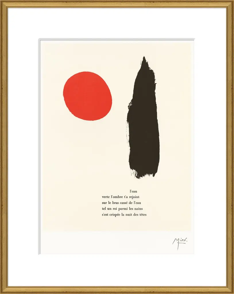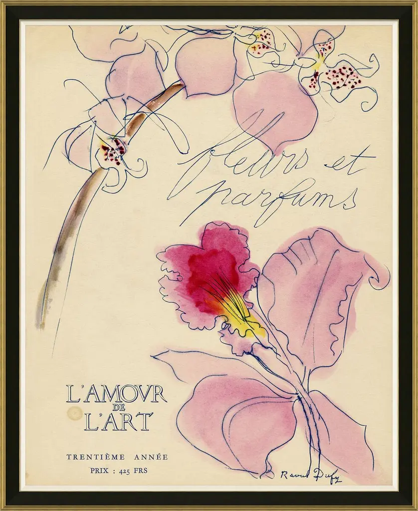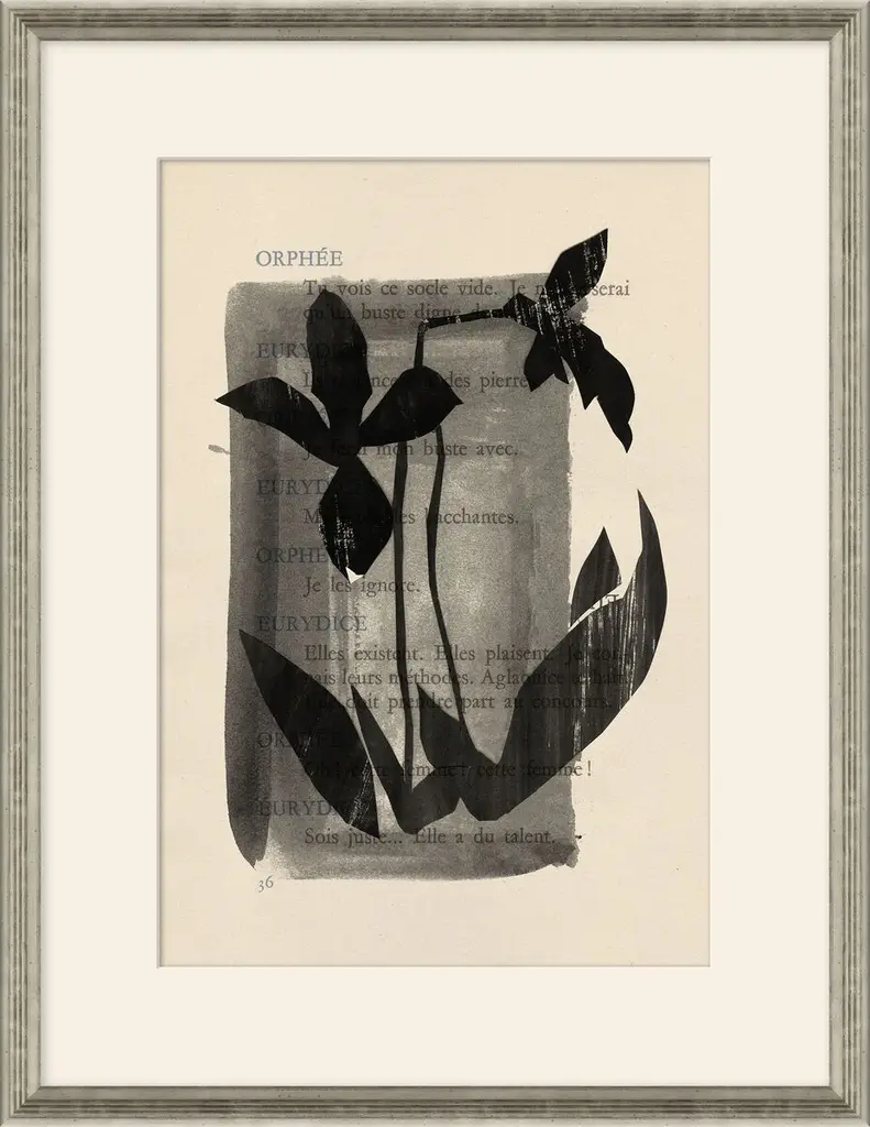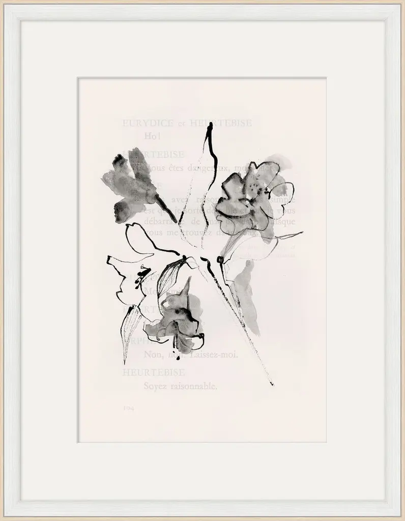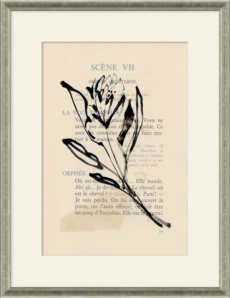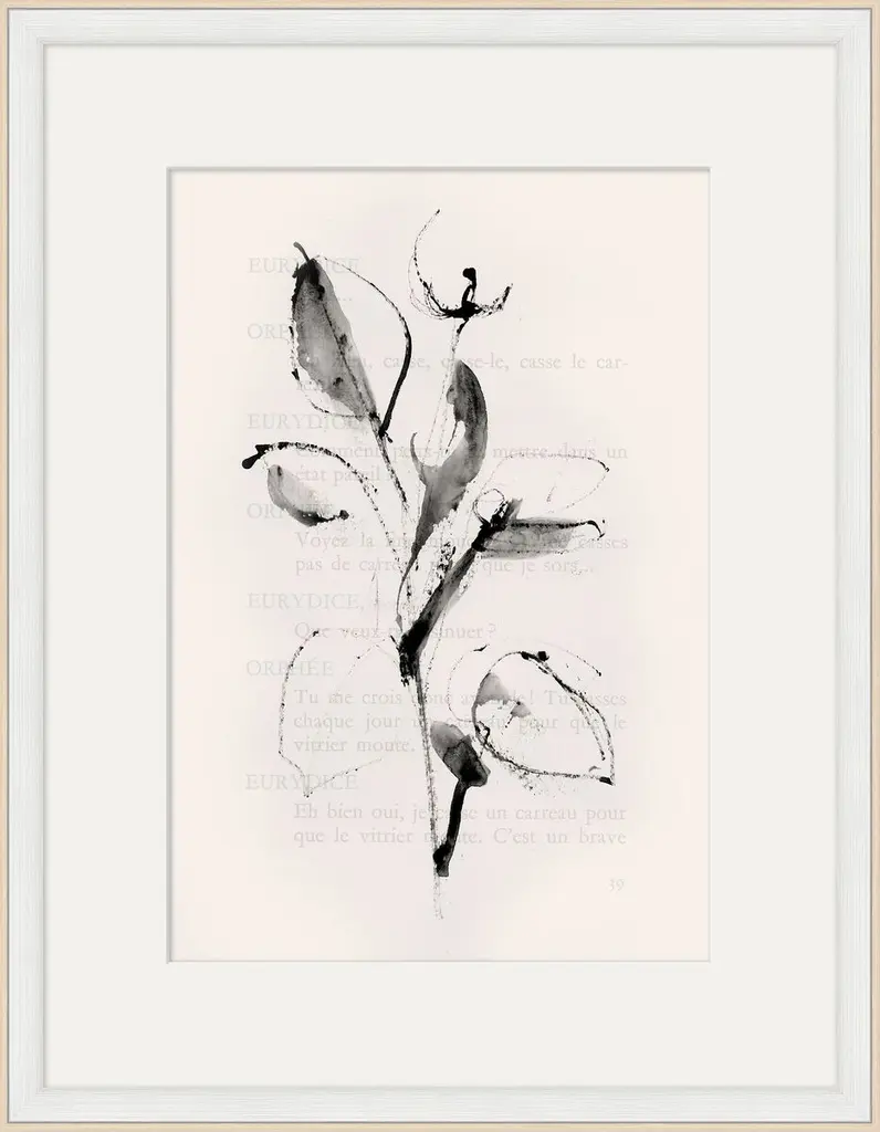 Artist and graphic designer Yuki Osada painted this simple but evocative botanical study over a page from Jean Cocteau's play Orphée, known in English as Orpheus. This giclée reproduction is printed on archival paper, matted, and set within a gold-trimmed white frame. It arrives ready to hang.
