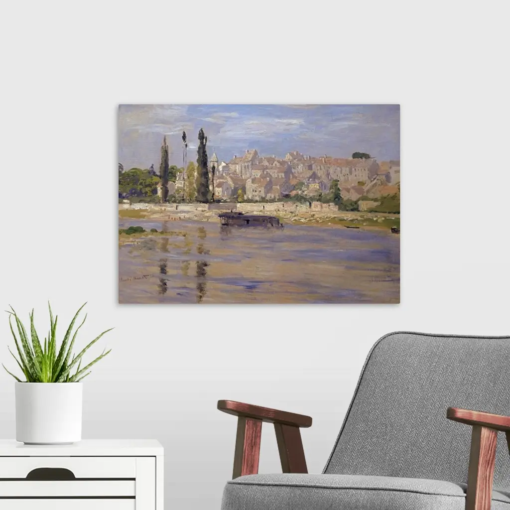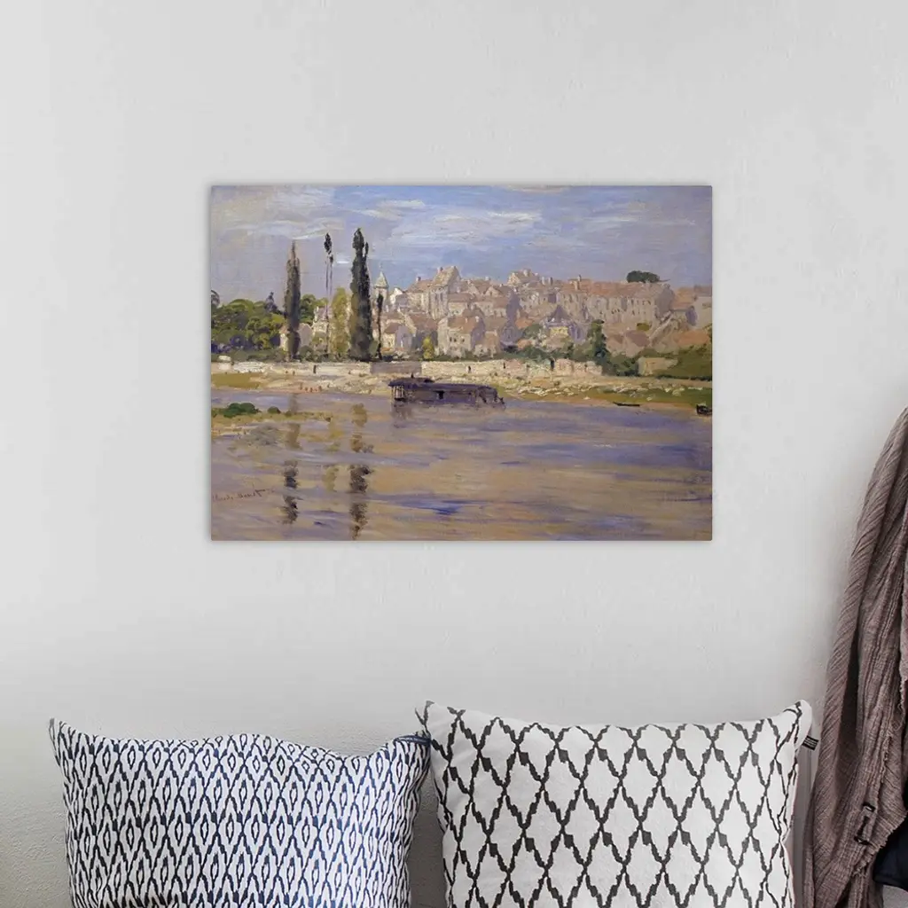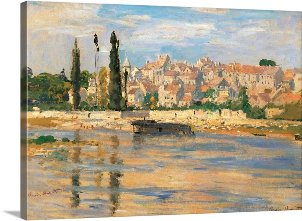 Oversized, landscape, classic art painting of a body of water in the foreground, a city with many buildings in the background, beneath a blue sky.