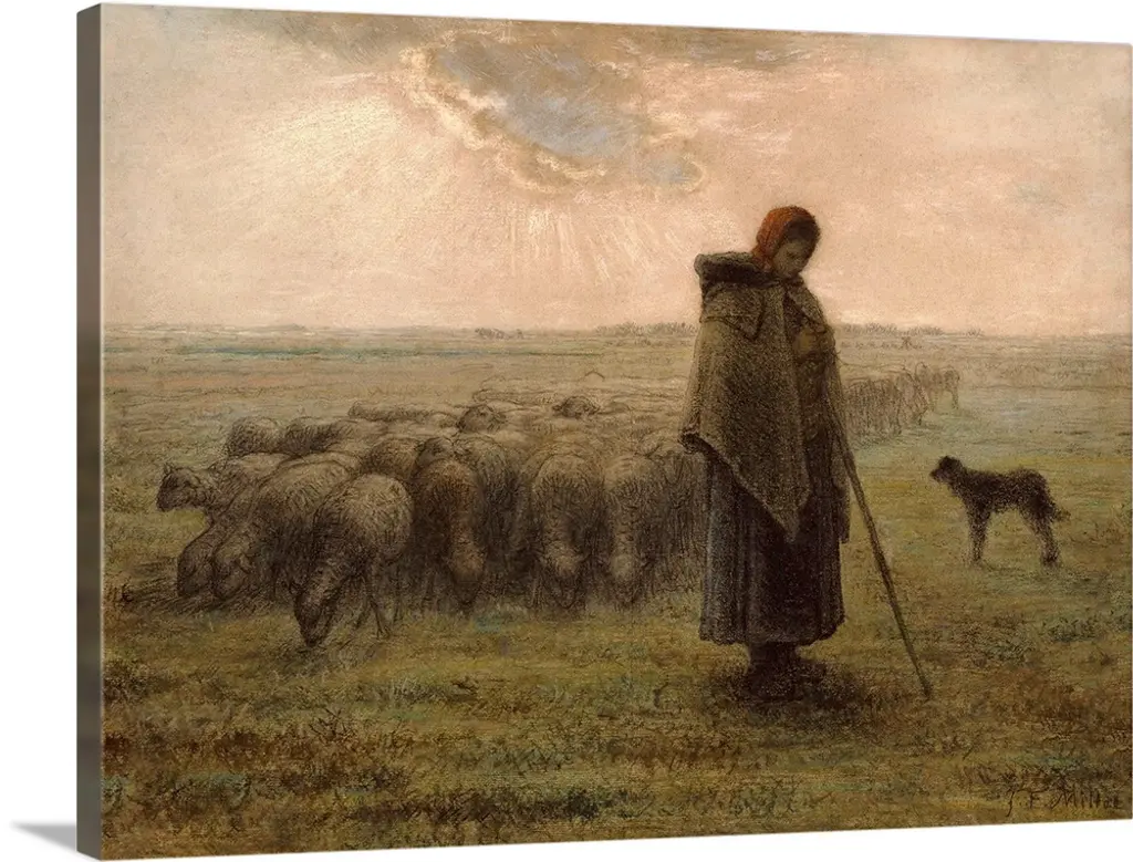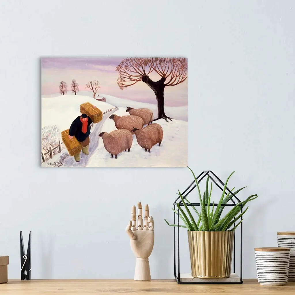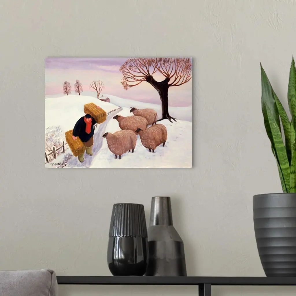 Contemporary painting of a farmer tending to his flock of sheep in the winter.