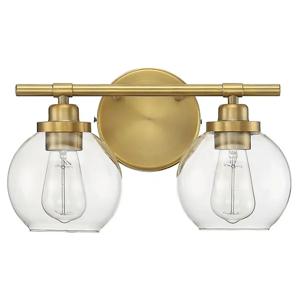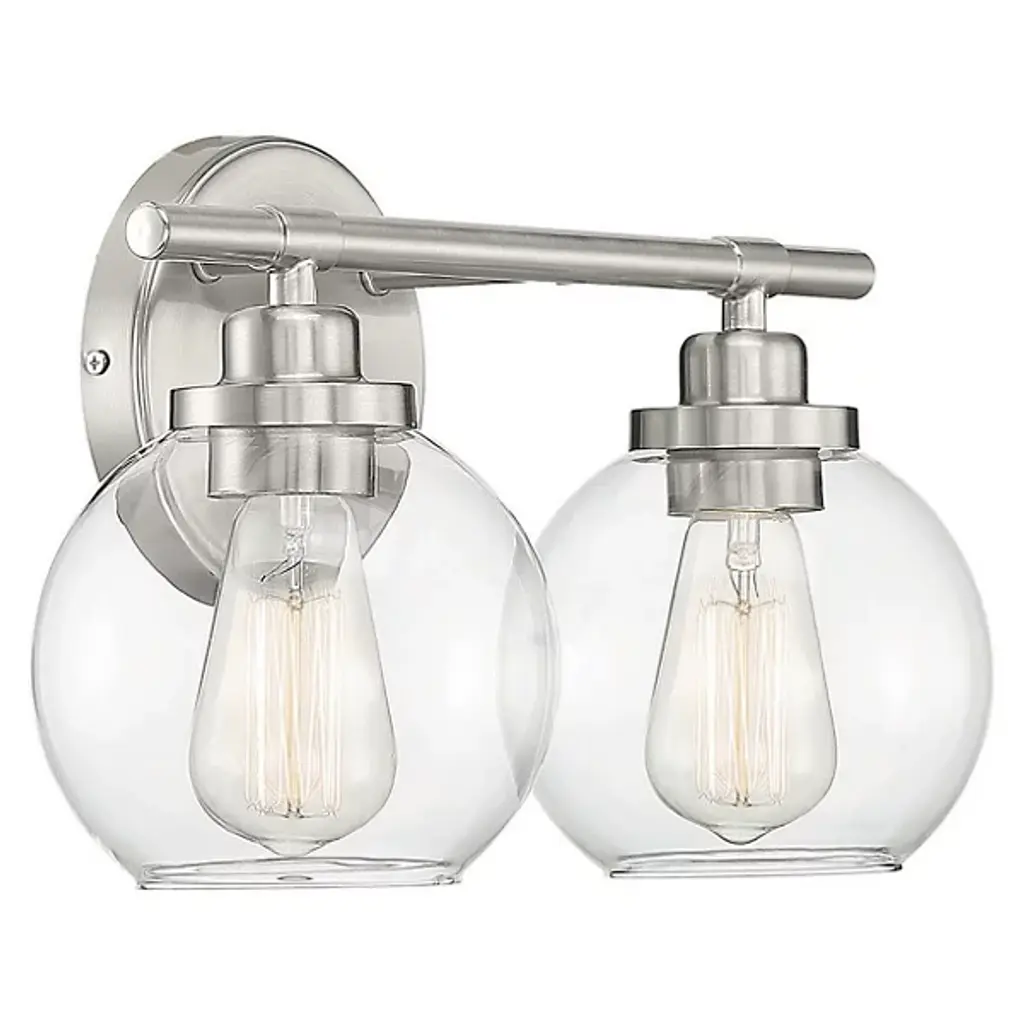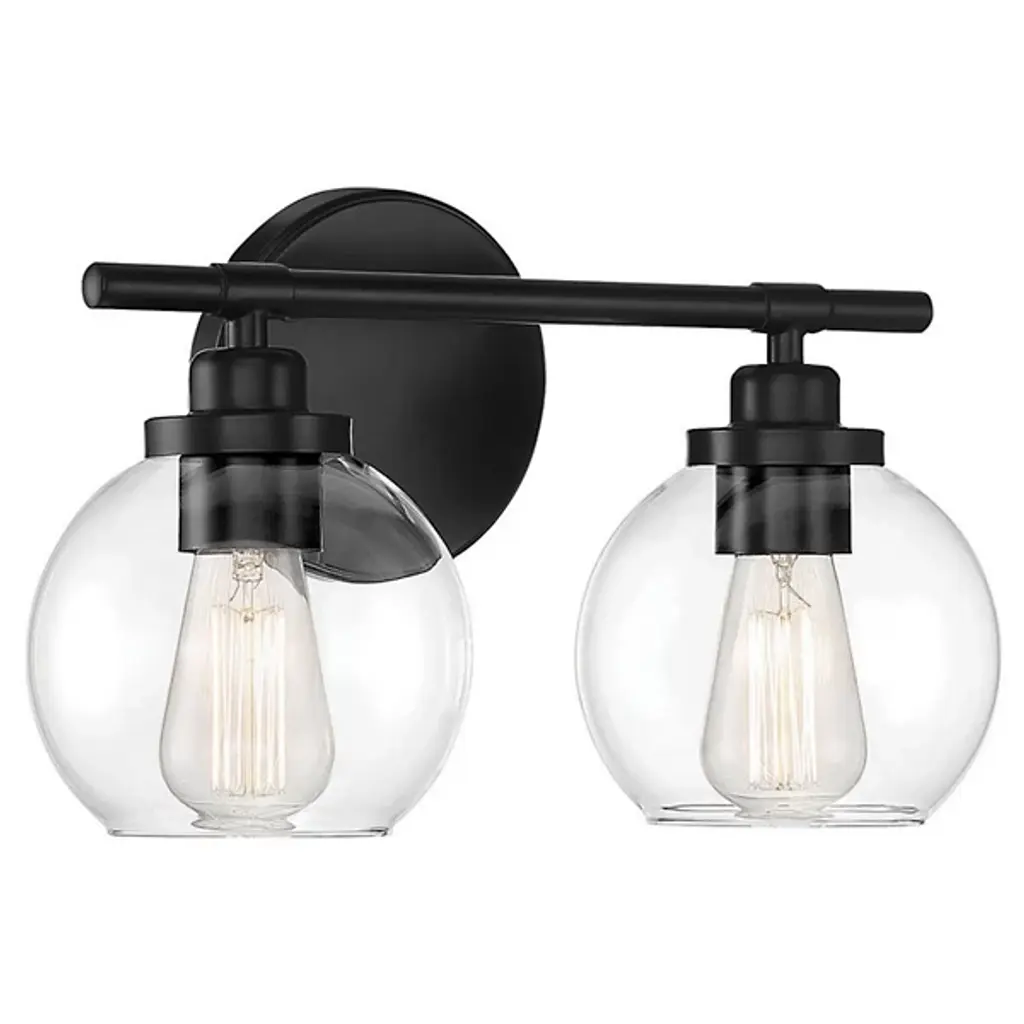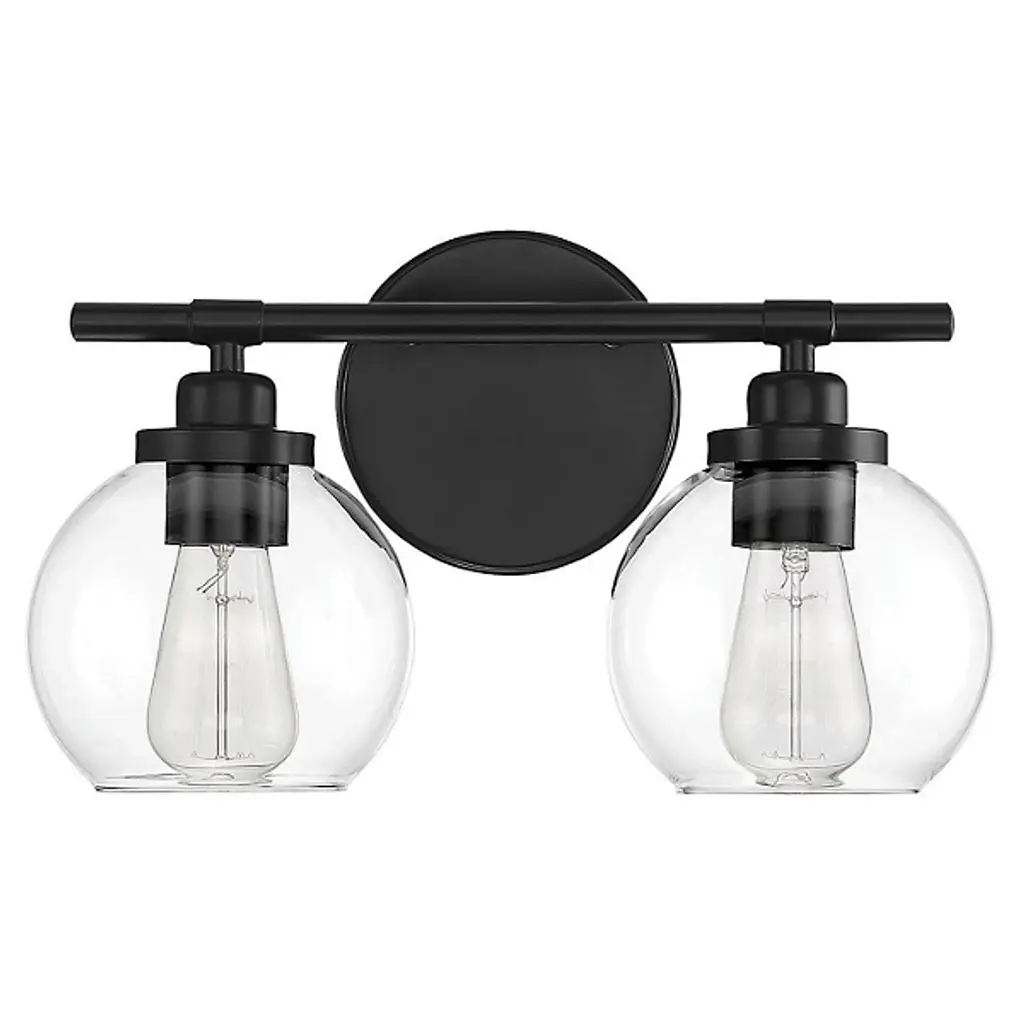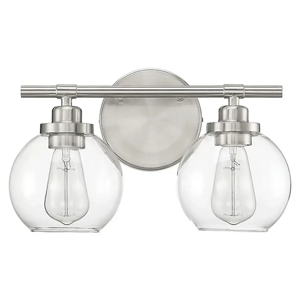 Give your bathroom a chic decorative touch with the Carson Vanity Light by Savoy House. This fixture boasts personality while remaining simple enough to adapt to a range of interior décor themes. Its glass globe shades contain visible incandescent bulb sockets and are held horizontally by a shared metal bar. A circular backplate reiterates its rounded theme and offers a sturdy anchor. When lit, this fixture casts a warm and inviting glow throughout the room.