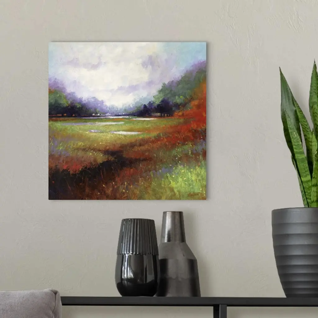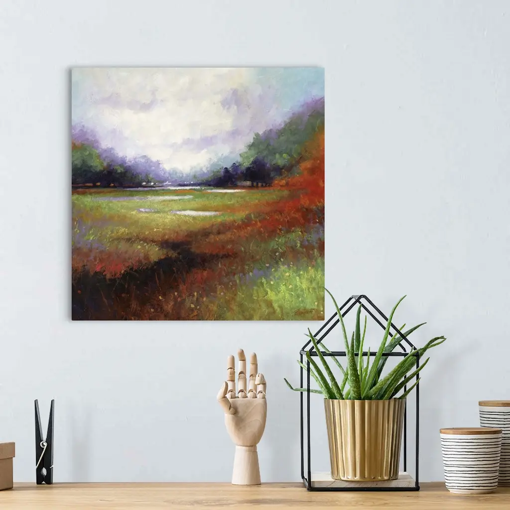 Contemporary painting of a colorful and idyllic countryside landscape.