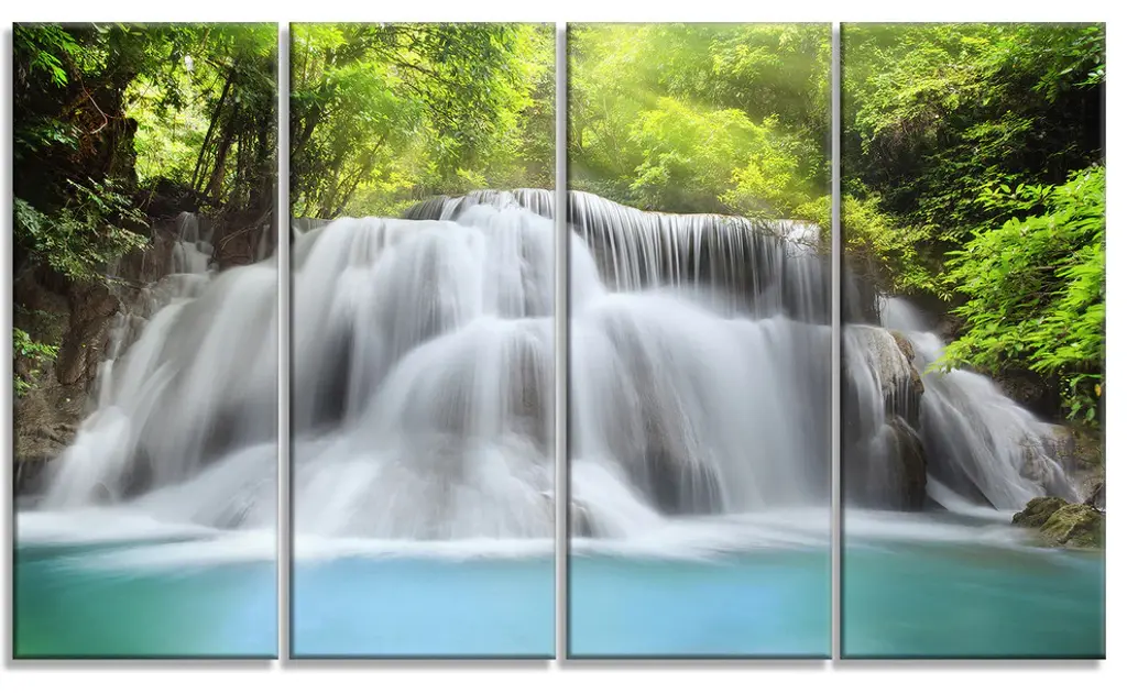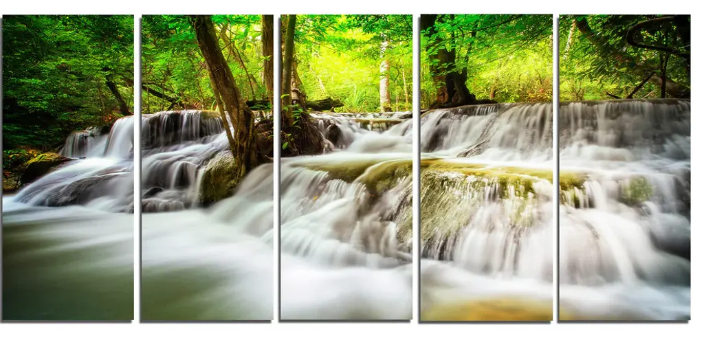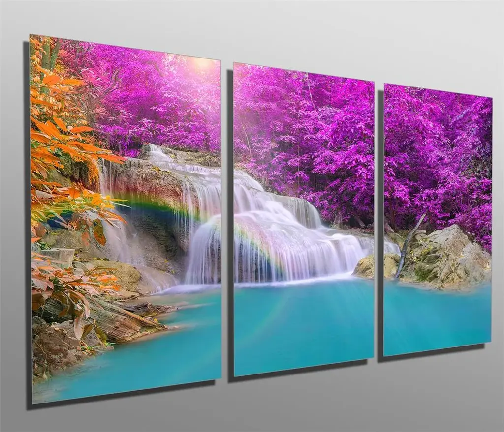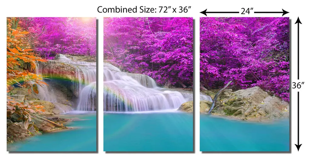 72"œ x 36"œ total size. Ready To Hang! (3 pieces - 24"œ x 36"œ each). 3 Panel Split (Triptych) Metal Print ft. cascading waterfall inside a forest with light purple leafed trees. Impress friends & family with this modern metal wall art. Great for interior design & wall decor. Printed on Luxurious, HD aluminum glossy metal p. HD aluminum panels. Metal print wall art. Includes Shadow Wall Mount on the back.• Aluminum Metal Wall Art• Made in USA• Ready to hang - No assembly required• Shadow mount hardware on the back• 0.045"œ thick HD Aluminum Panels• Scratch resistant, glossy finish• Superb color clarity, luxurious prints• Epson printing process• For indoor or moisture rich environment use• Easy to clean. Gently wipe with microfiber cloth.