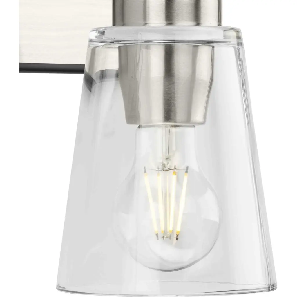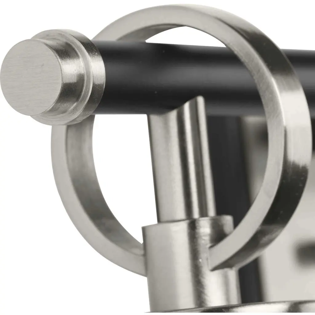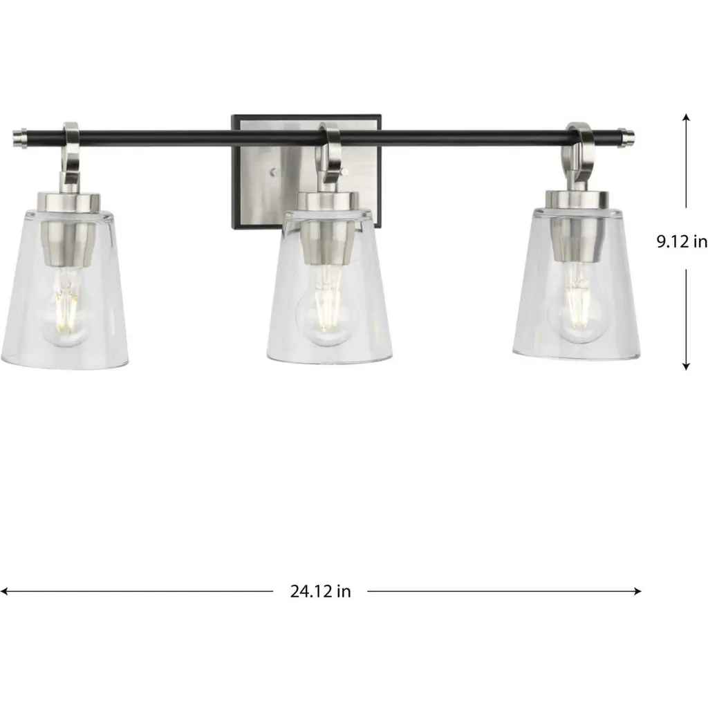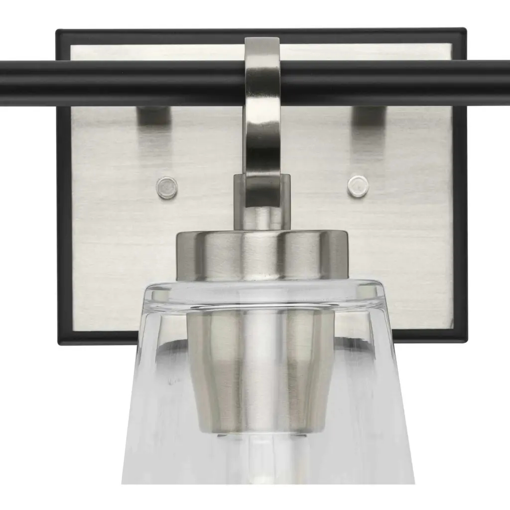 The Cassell Three-Light Vanity Fixture brings an enduring style to the bath. The light boasts a dual-tone finish of Brushed Nickel and Matte Black that accentuates its distinguished and handsome design. Tailored details smoothly blend linear precision with elegant circular rings and clear glass shades.