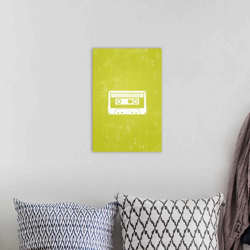 Retro artwork that has a silhouette of a cassette tape against a neon green background.