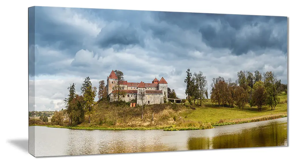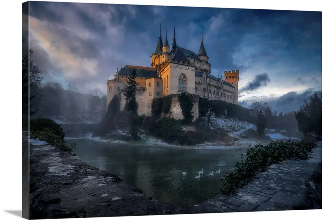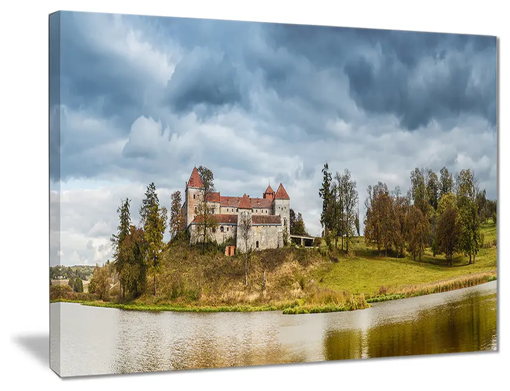 The Castle by the Lake canvas art print is sure to make an impression on anyone who sees it. This artwork is gallery wrapped around a 1-inch solid wood frame and arrives carefully packaged and entirely ready to hang on the wall. Design Art only uses the highest resolution and pigments to ensure a crisp colorful print that is never faded or pixelated. This artwork is sure to be a conversation starter in any home or office.