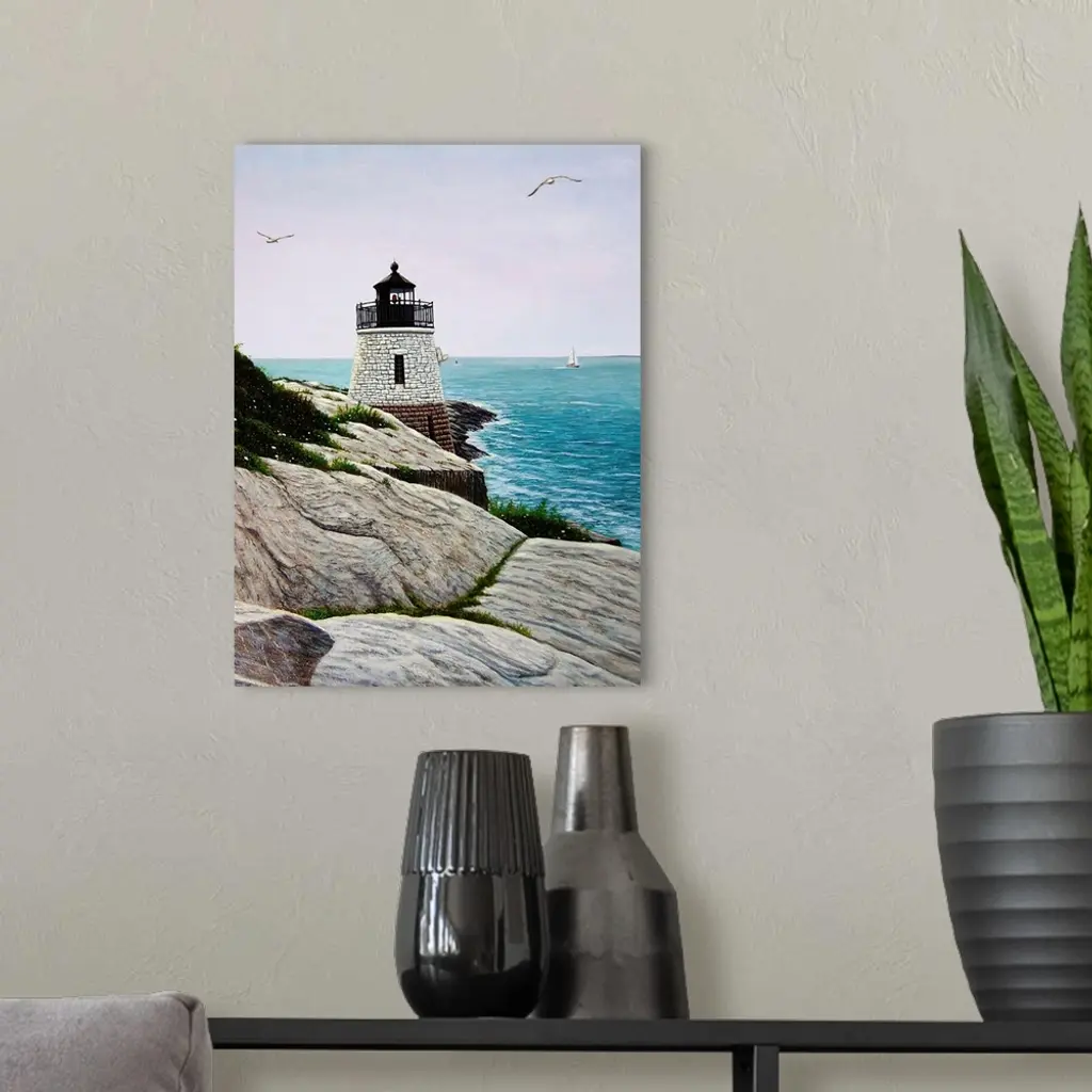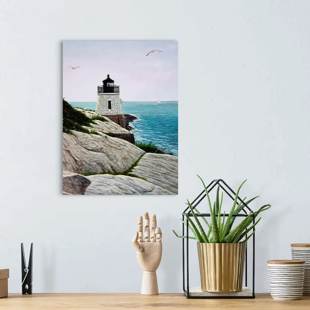 Contemporary painting of the Castle Hill Lighthouse overlooking the ocean and seagulls in sky.