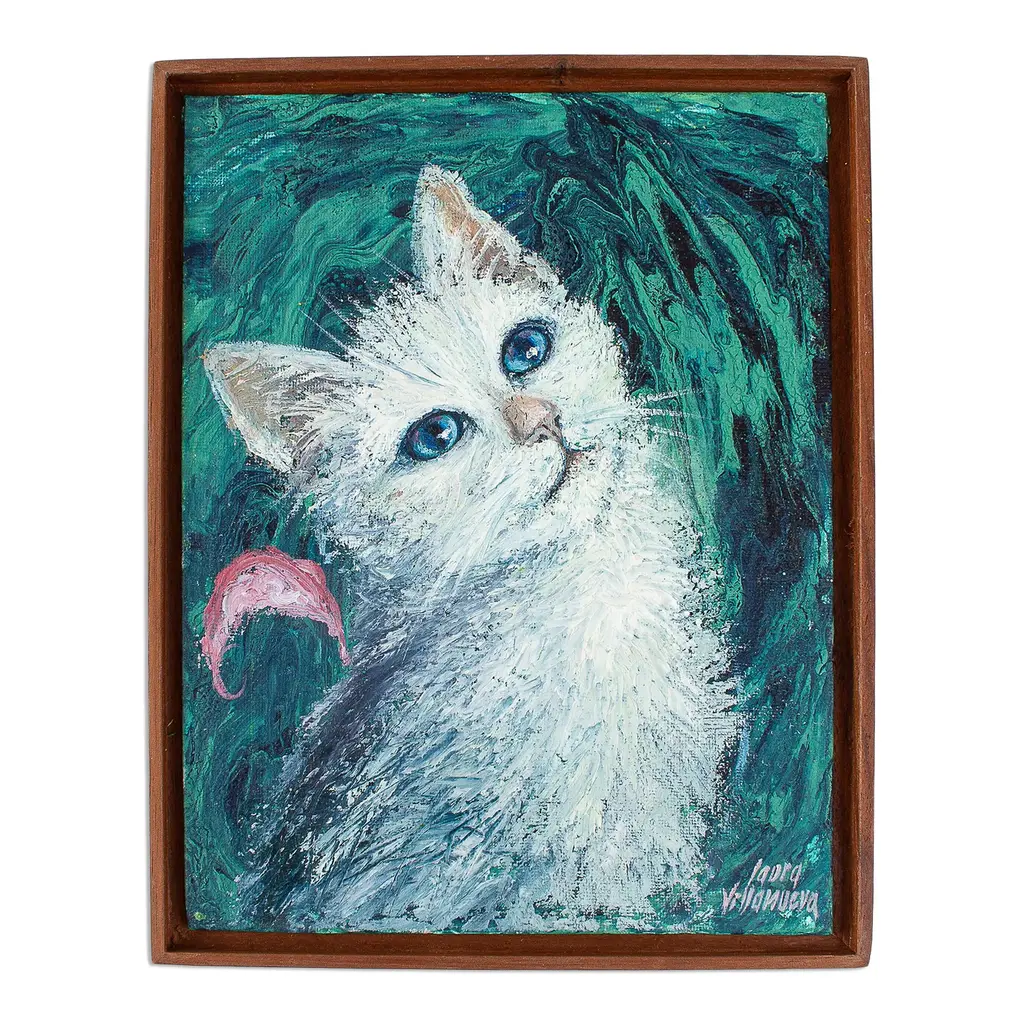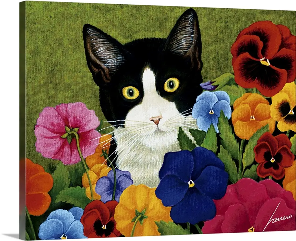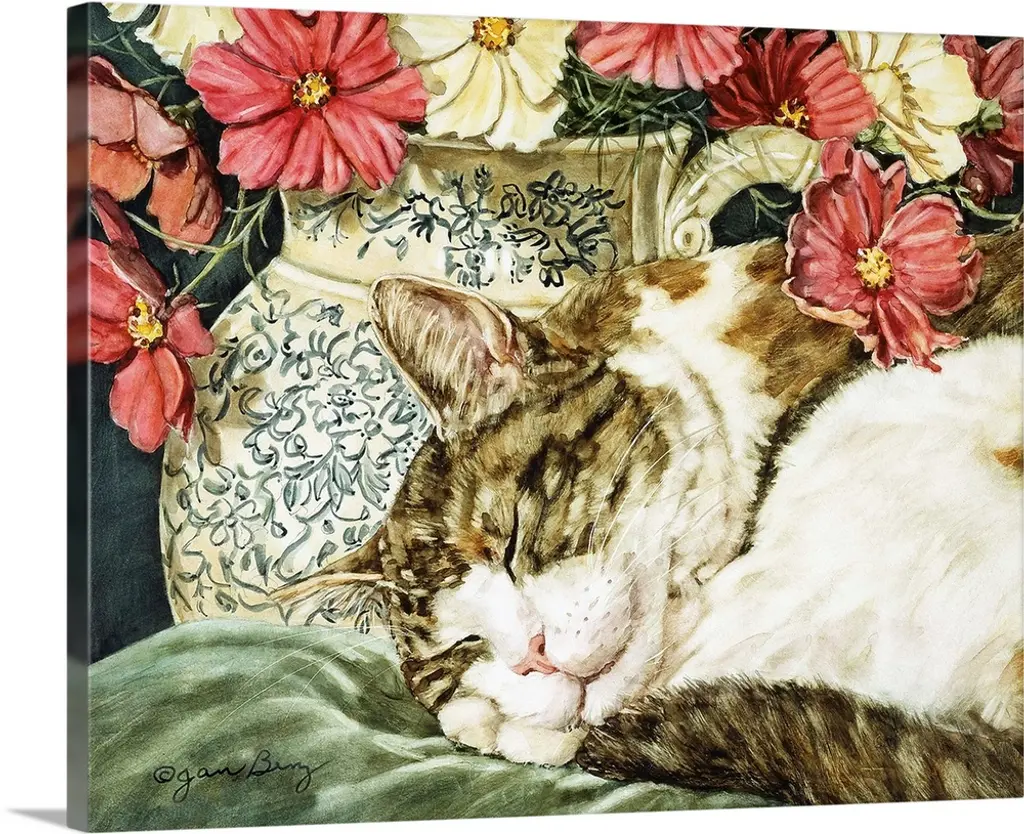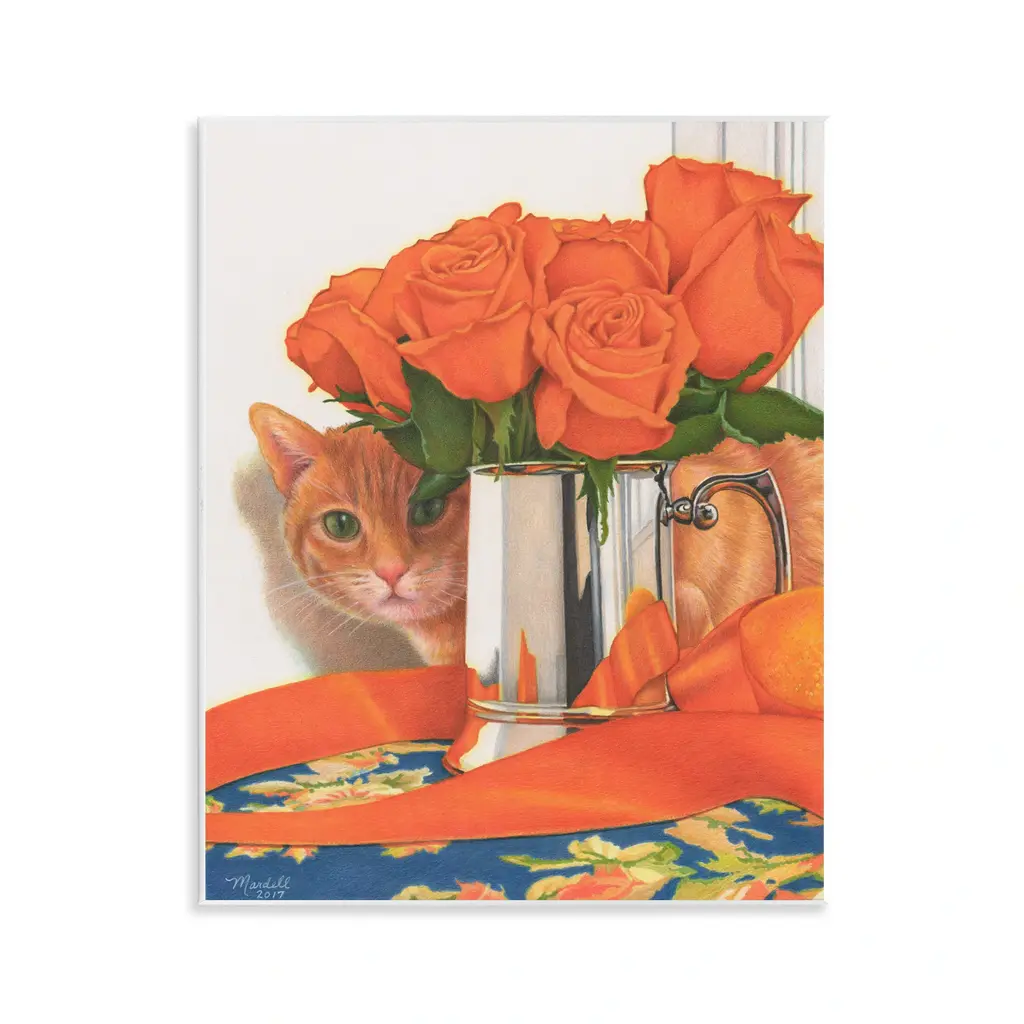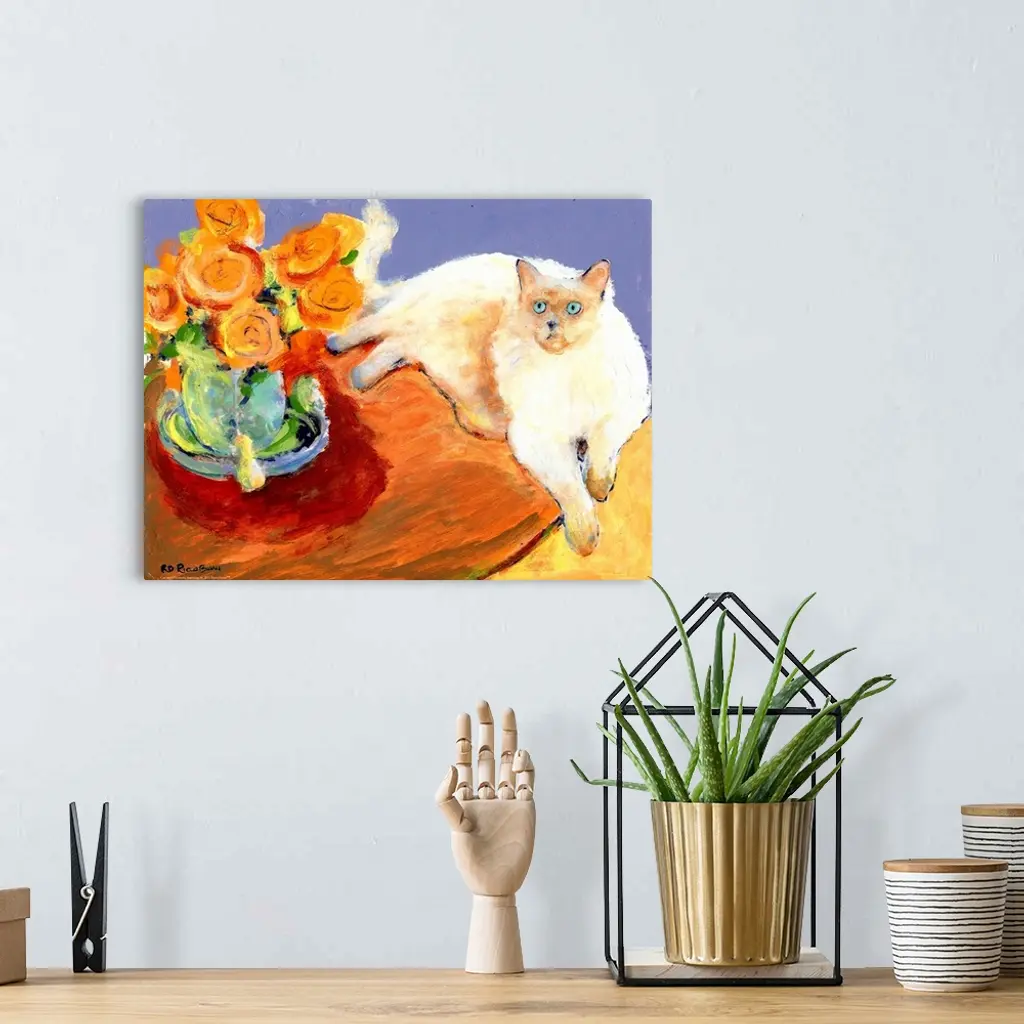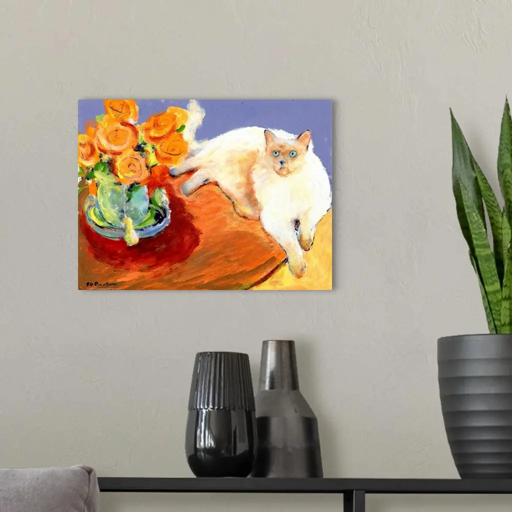 Cat and Flowers, painting by RD Riccoboni. This ragdoll cat lounging on a table next to a vase of roses. Painted in the impressionist style.
