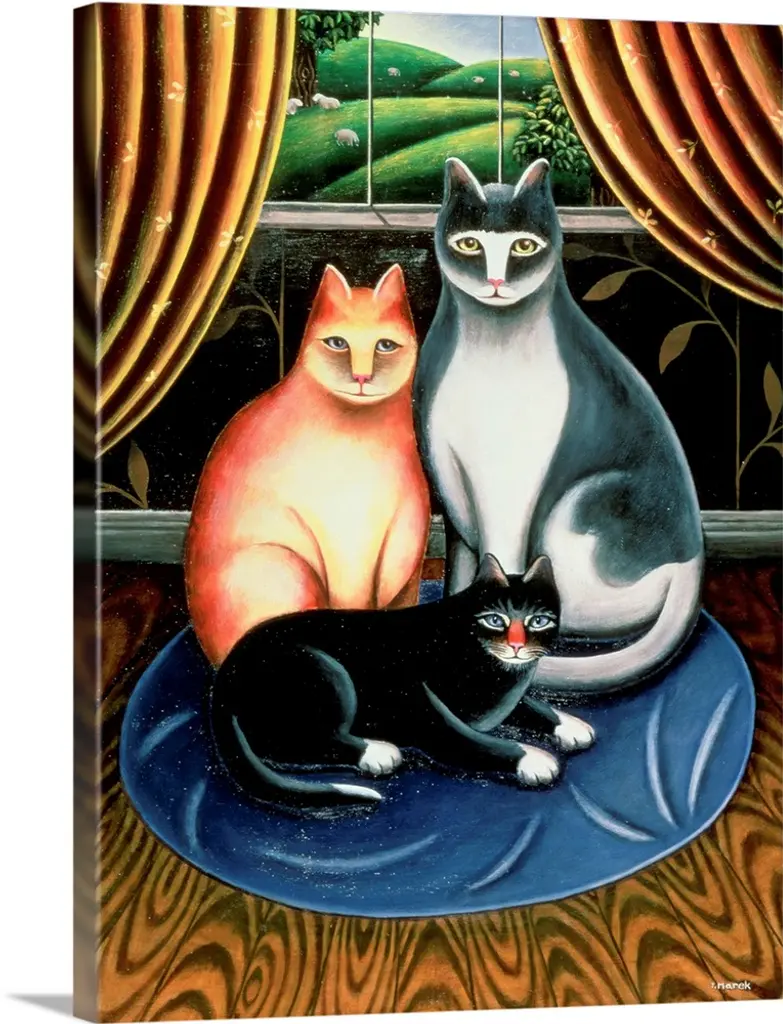 Cat and Kittens, by Anonymous, c. 1872-83, American painting, oil on millboard. Naive painting of a cat and two kittens playing with a ball of yarn