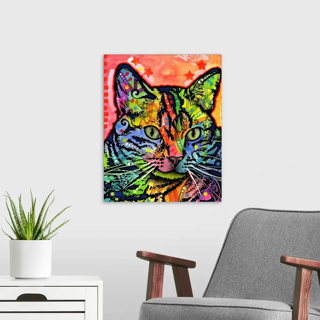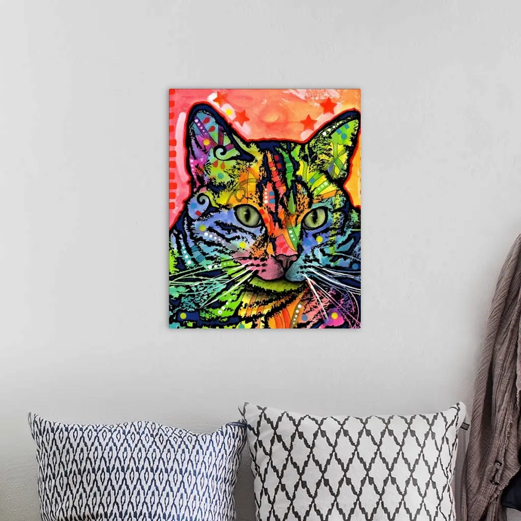 Contemporary stencil painting of a cat filled with various colors and patterns.