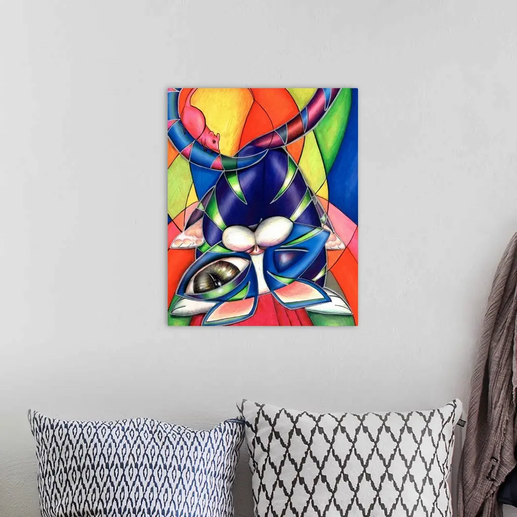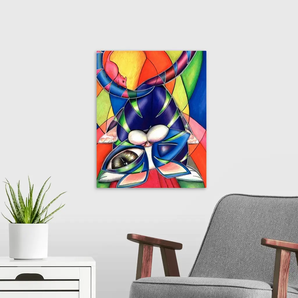Contemporary artwork in the style of cubism of a cat with a mouse in bold colors.