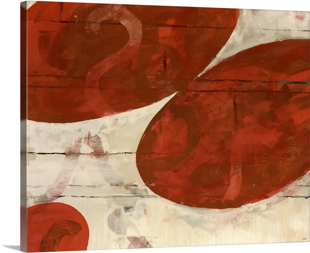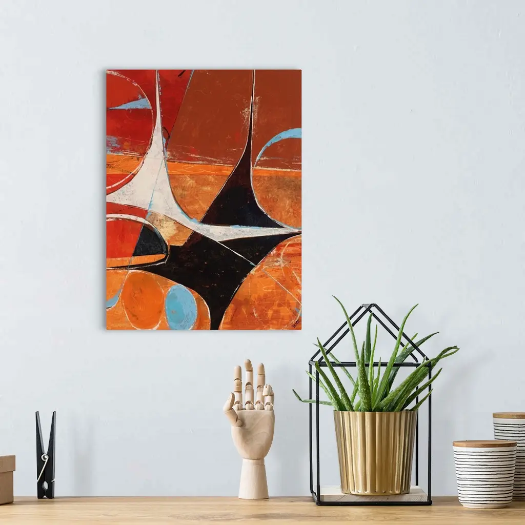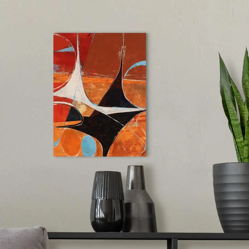 Contemporary abstract painting of various shapes and colors mingling in a retro looking frenzy.