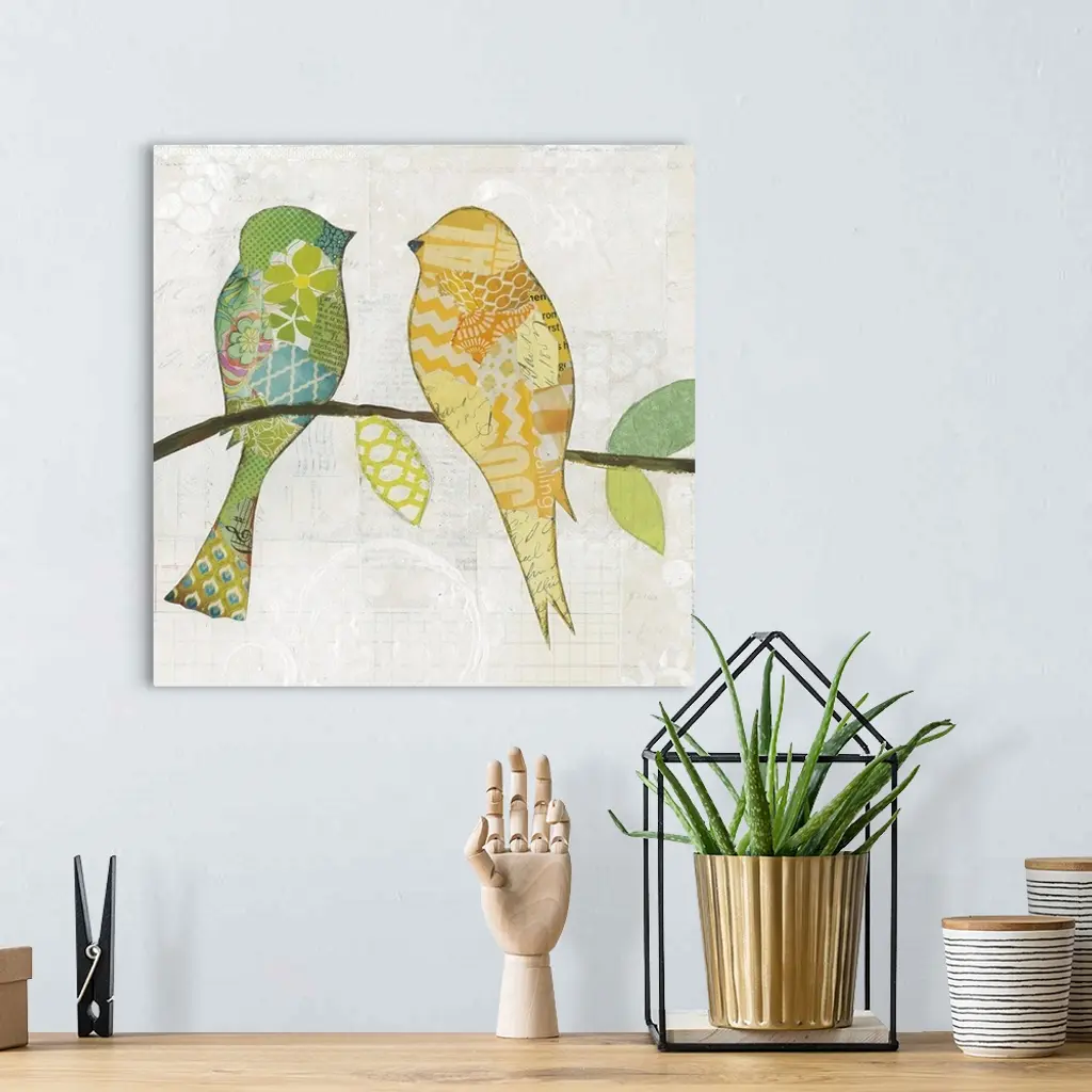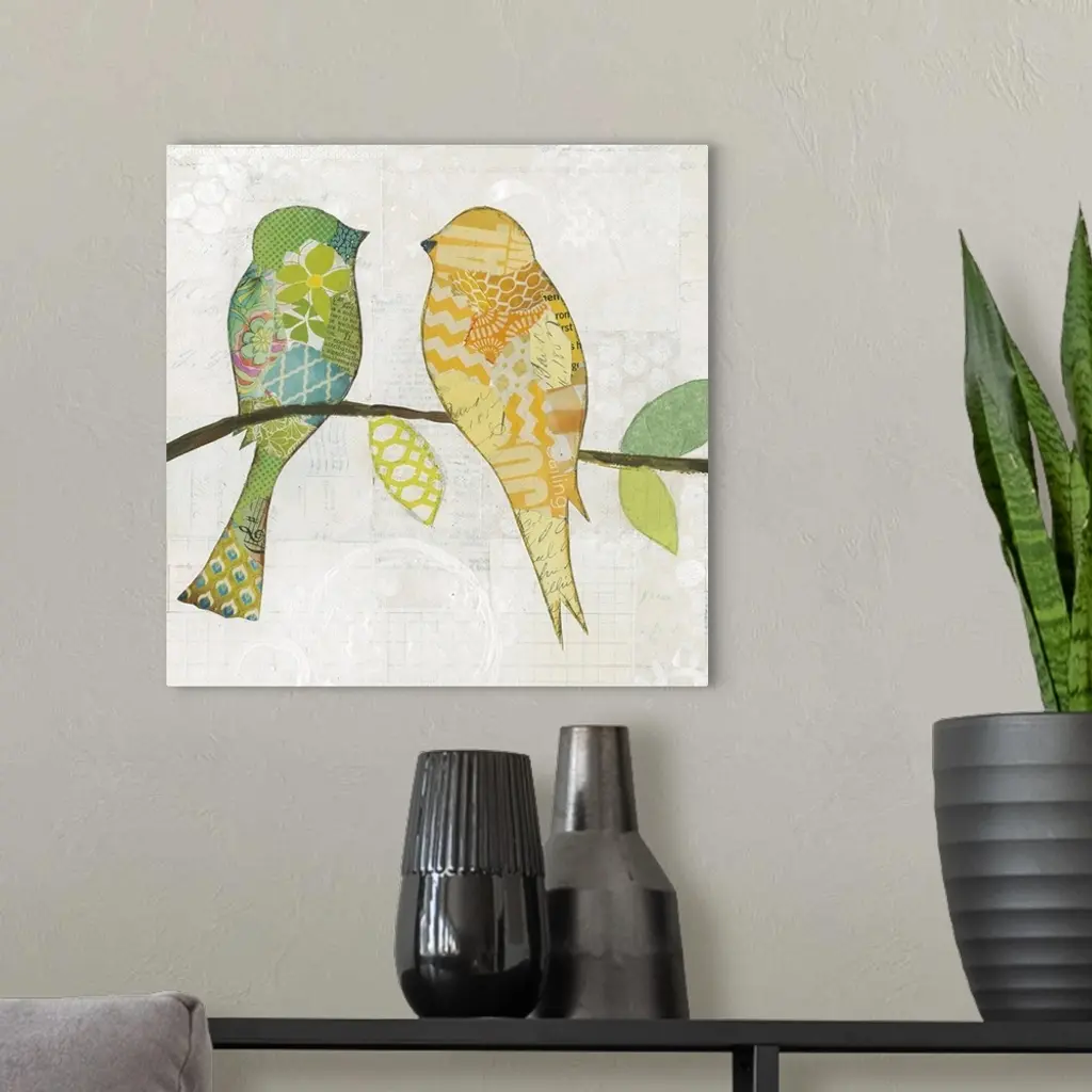 Artwork of two birds silhouettes made from collage clippings perched on a branch against a neutral toned background.