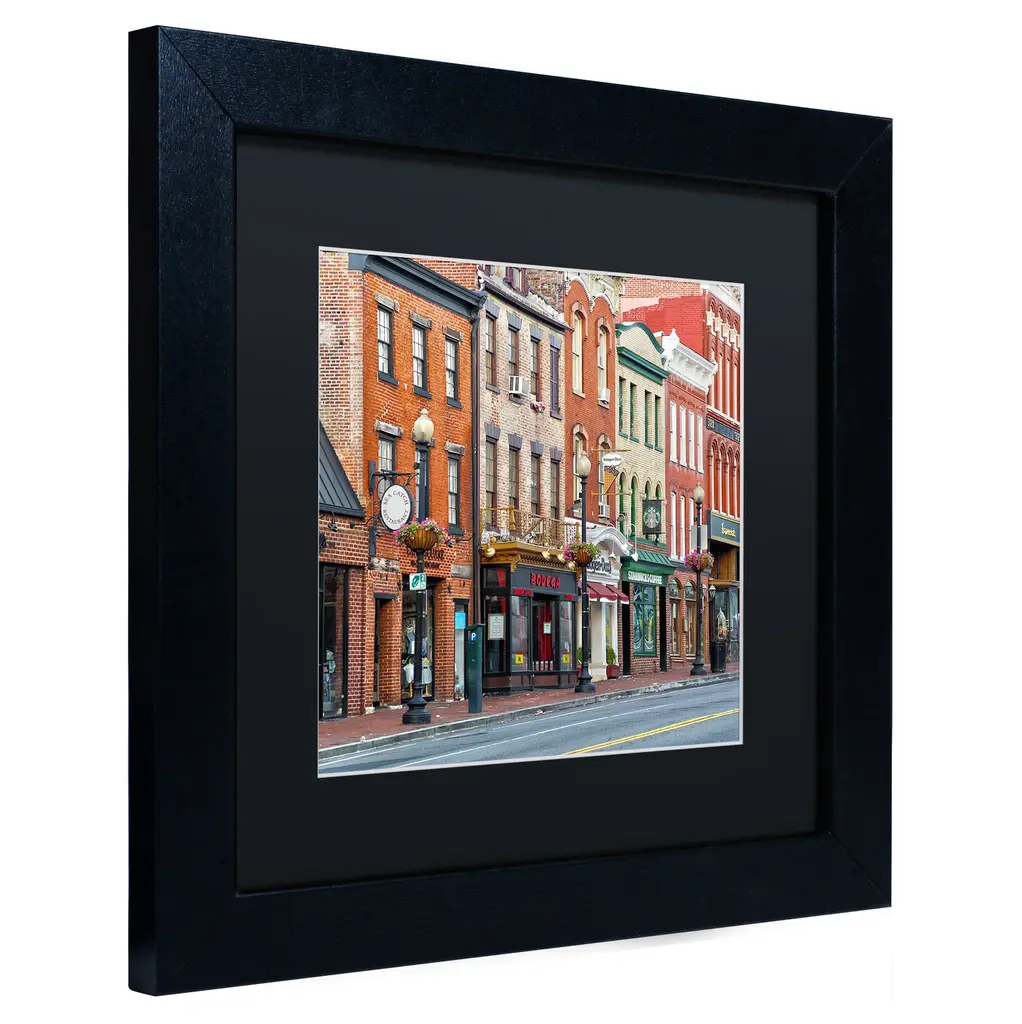 Artist: CATeyesSubject: LandscapesStyle: ContemporaryProduct Type: Black Frame, Black Mat, AcrylicMade in USAThis ready to hang, matted framed art piece features a row of shops in Georgetown, a historic district of Washington, D.C.Mitch (aka CATeyes) Catanzaro is a freelance photographer. He has sold thousands of images to a wide variety of customers. His work has been purchased by several online travel companies, international advertising and marketing corporations, as well as individual clients.A 7x7 giclee print under acrylic in an 11x11 black frame. Giclee (jee-clay) is an advanced printmaking process for creating museum quality fine art reproductions. This high quality print is matted using black matting and comes in a black frame. A clear acrylic facing is added to protect the print. The piece is fully assembled by professional framers and comes ready to hang. The black mat allows the image to really stand out, making it a great addition to any space.Canvas: 100% Cotton, Frame: MDF, Matte: Paper-Laminated 100% Wood Fiber Core, Facing: Acrylic