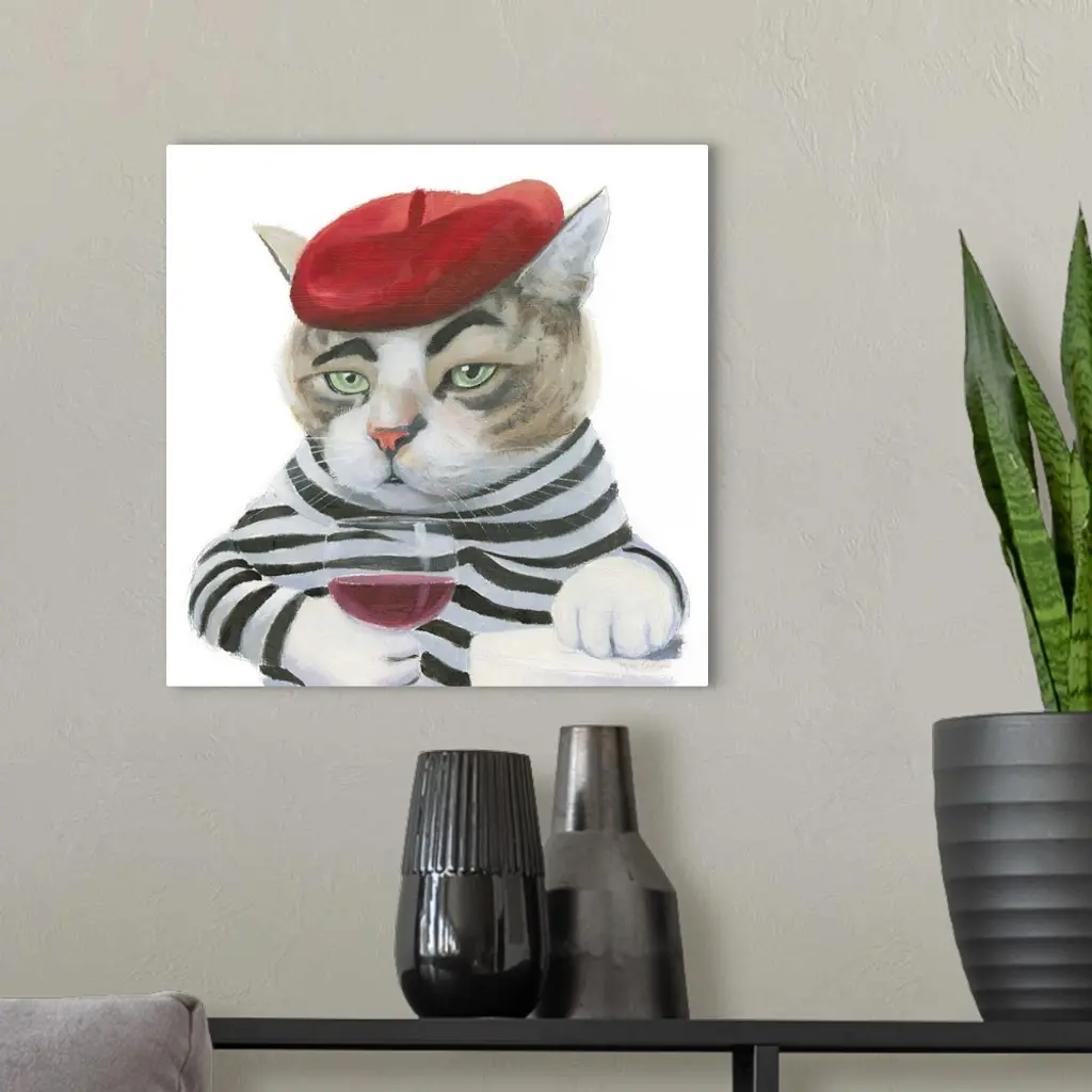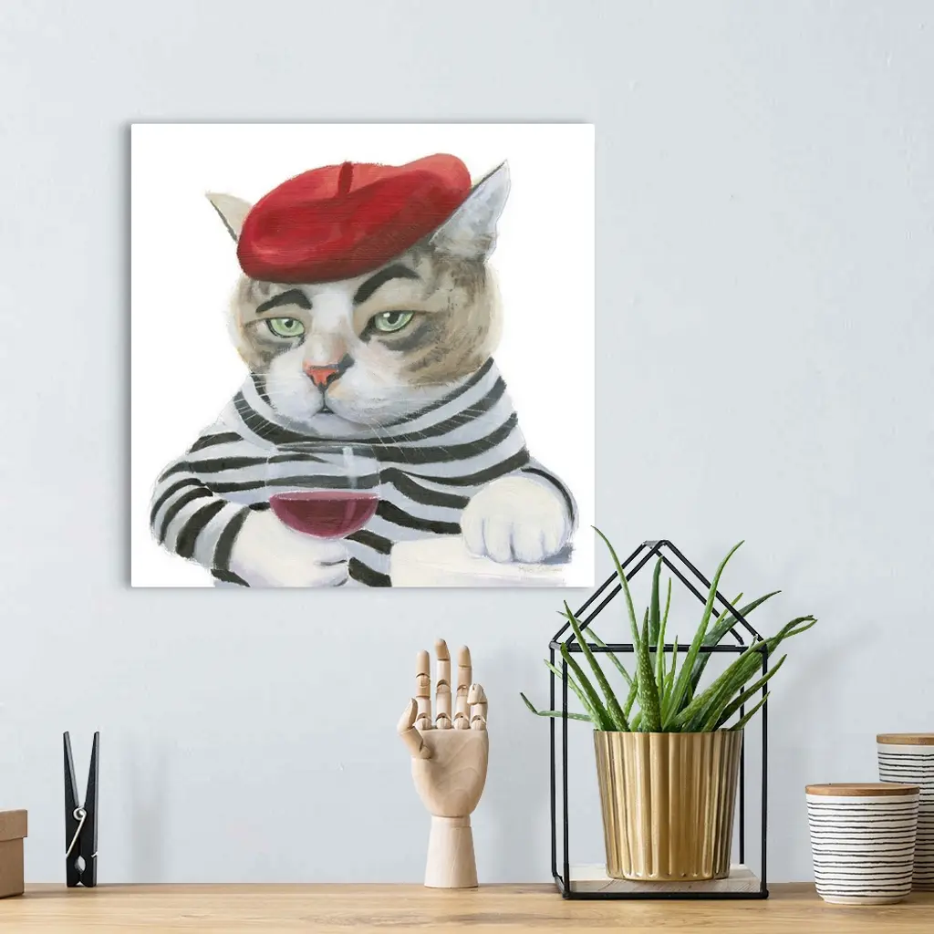 Square painting of a French cat wearing a red beret and a black and white striped shirt, drinking a glass on red wine on a white background.