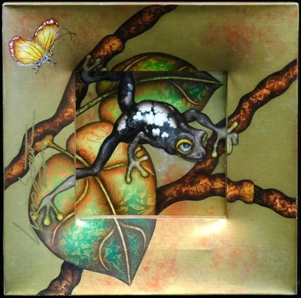 "Cautious" Black Frog Hand Signed #Hr1103 Naturalismo On Canvas By Luis Sottil