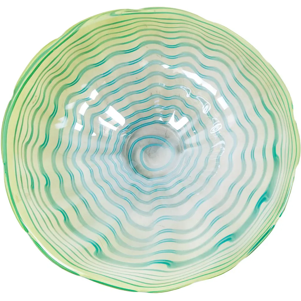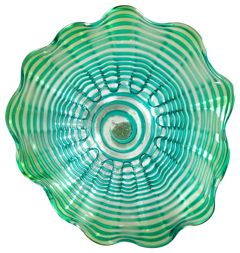 The cool, soothing tones of our Cavalier Series will give a tranquil feel to any room in your home or office. This plate is made of Favrile Art Glass which is hand blown in concentric waves of green in the middle on a white background edged with green color. You can hang it on the wall with hardware provided or simply display on any flat surface. Because the Favrile Process embeds the color within the glass itself, no 2 pieces are exactly alike. This means that yours is a one of kind work of art. Each of the plates features a gently ruffled edge, giving the feel of a delicate blossom. A pleasant grouping of these plates in variety of sizes as wall art adds the ideal finishing touch to any decor. These plates make an excellent gift for any occasion that is sure to be enjoyed for a lifetime. Note Due to the nature of handcrafted or hand blown art glass, colors, sizes and patterns may vary slightly.