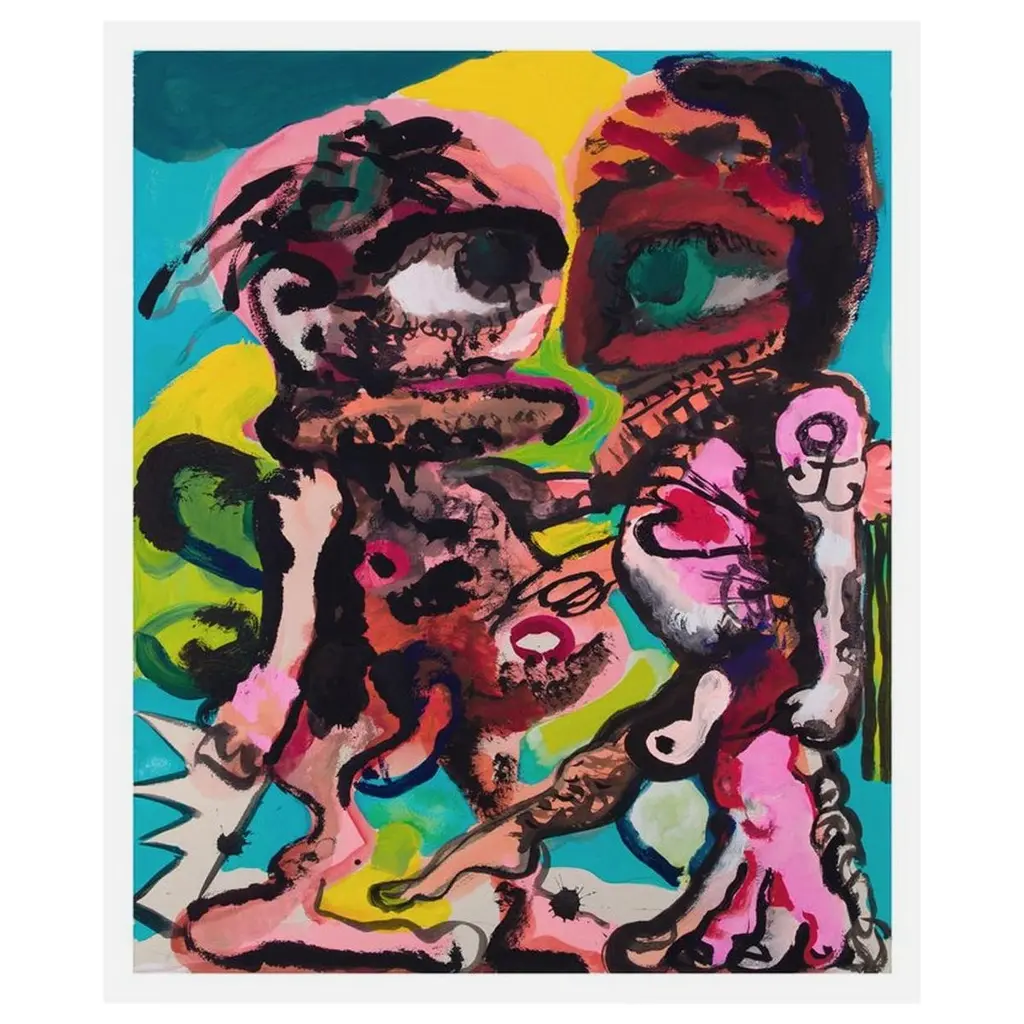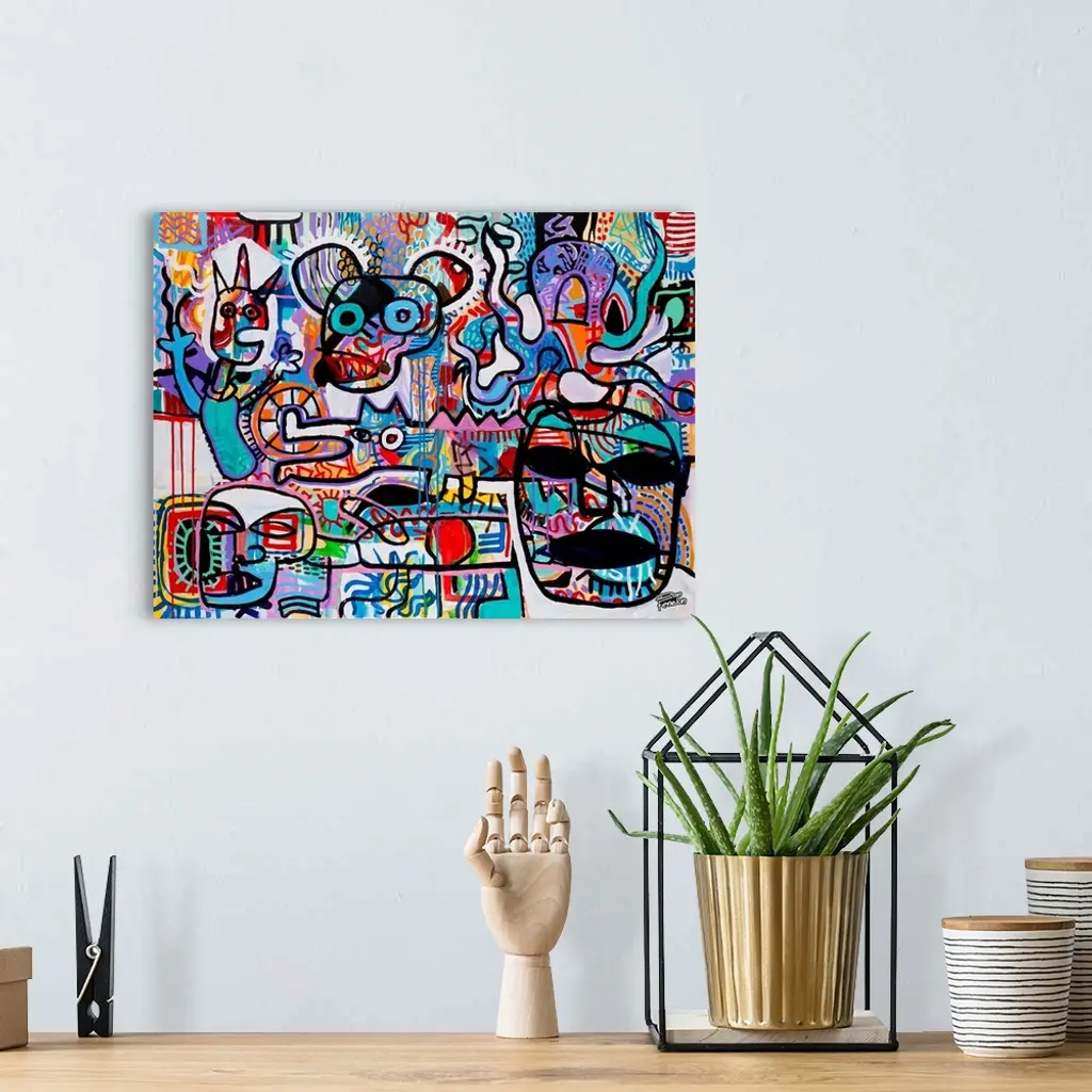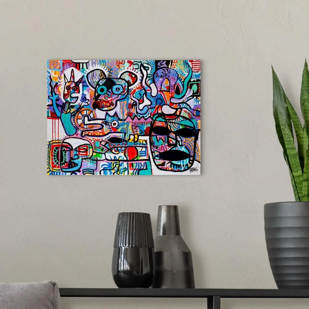 Contemporary abstract painting using mouse forms with human forms in an urban art style.