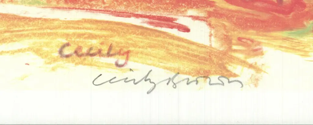Artist: Cecily Brown Title: American Dance Festival Year: 2001 Signed: Yes Medium: Serigraph Paper Size: 22 x 29.5 inches ( 56 x 75 cm ) Image Size: 22 x 29.5 inches ( 56 x 75 cm ) Edition Size: 100 Framed: No Condition: A: Mint Additional Details: This striking silkscreen print by Cecily Brown, created for The American Dance Festival in 2001, captures a couple dancing center stage, surrounded by an abstracted, energetic room. Though the figures and crowd are rendered in Brown's signature abstract style, the sense of movement and vibrancy fills the scene. Signed and numbered in pencil out of an edition of 100, the piece exemplifies Brown's bold and complex approach, blending figuration and abstraction to evoke the rhythms of dance. Her work pushes the boundaries of contemporary painting, bridging emotion and movement through her vibrant interplay of color, form, and gesture, solidifying her influence on the abstract movement. This original print captures the festival's energy and grace, reflecting Brown's dynamic approach. It represents a valuable piece for collectors, showcasing her significant contributions to abstract art and her innovative blending of gestural abstraction with modern sensibility.