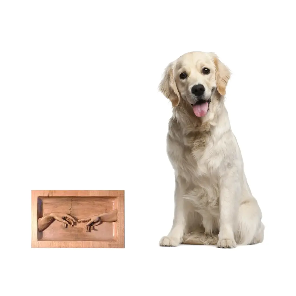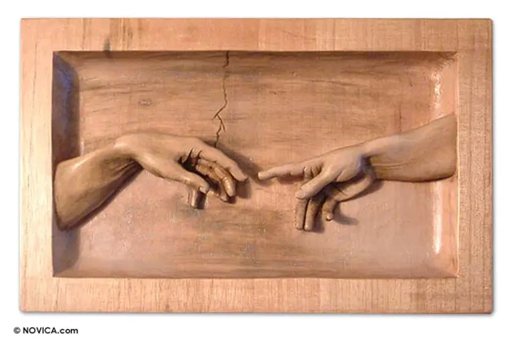 God reaches across the heavens and passes the spark of life to the first man. The Montalvo Family recreates a portion of the Michelangelo painting "The Creation of Adam" that graces the Sistine Chapel in Rome. Working in cedar wood, they carefully carve this beautiful relief panel as an expression of their own deep faith. A metal hook at the back facilitates hanging.