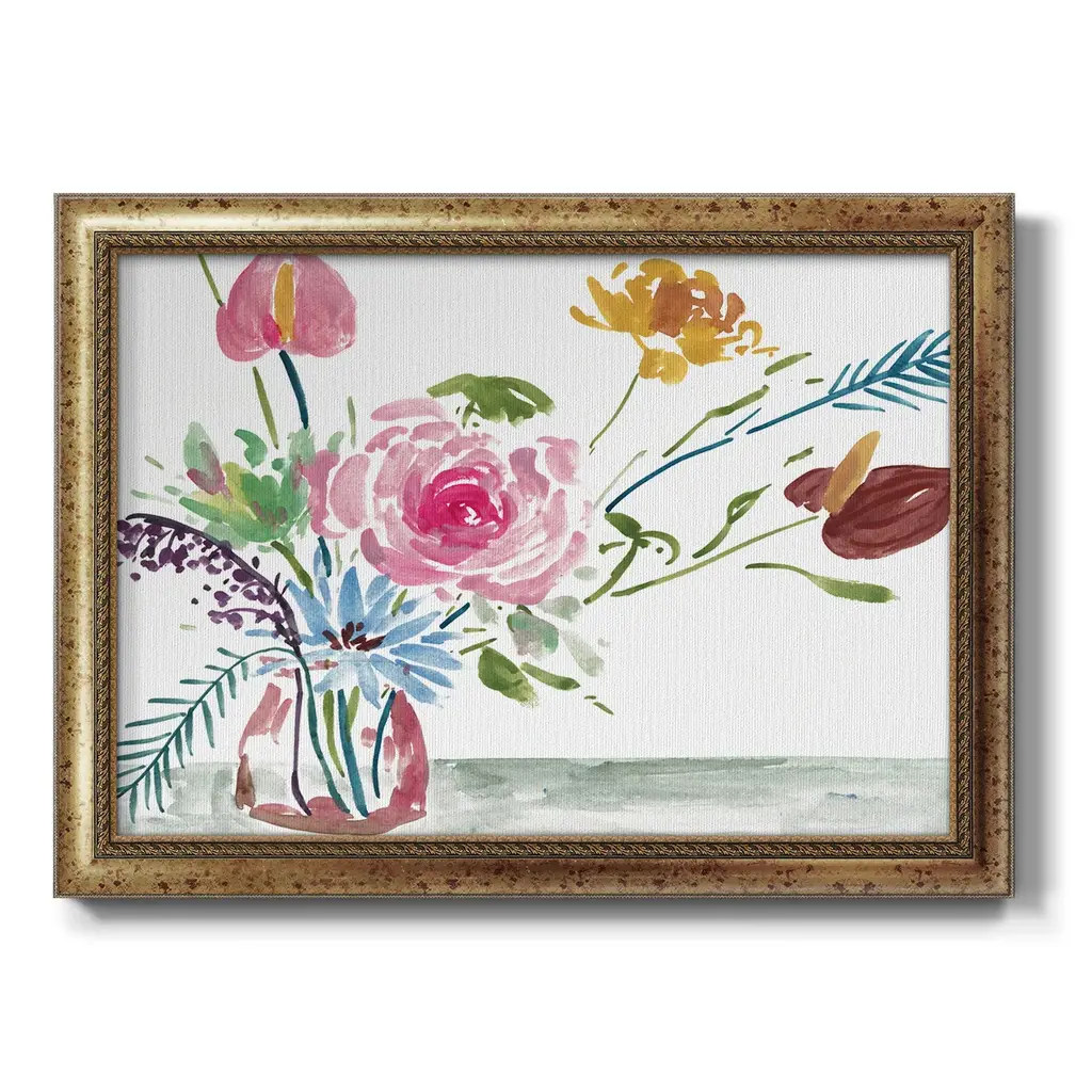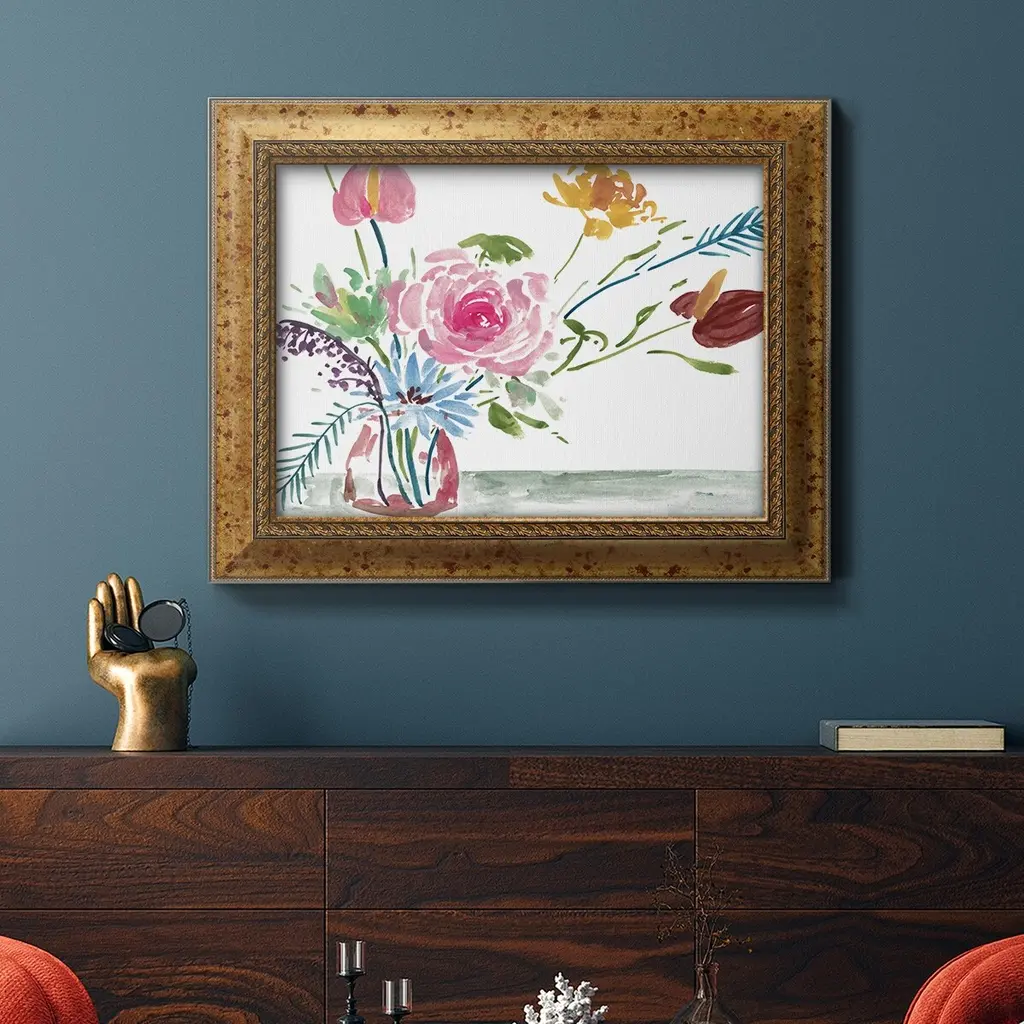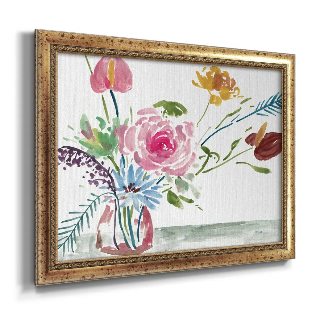 Celebration Bouquet I Premium Framed Canvas- Ready to Hang A Premium Framed Canvas created to last. Framed in distressed wood and available in an array of sizes and colors Featuring a beveled a solid wood stretcher bar, each piece comes ready to hand 3 SIZES AVAILABLE 16''X20'' - Overall Size 18'X27'' - Overall Size 24''x36'' - Overall Size Each piece is made to order. Each piece comes with hanging hardware. Made in the USA Ready to Hang Giclee Paper Print Acrylic Glass Beveled Matt Board