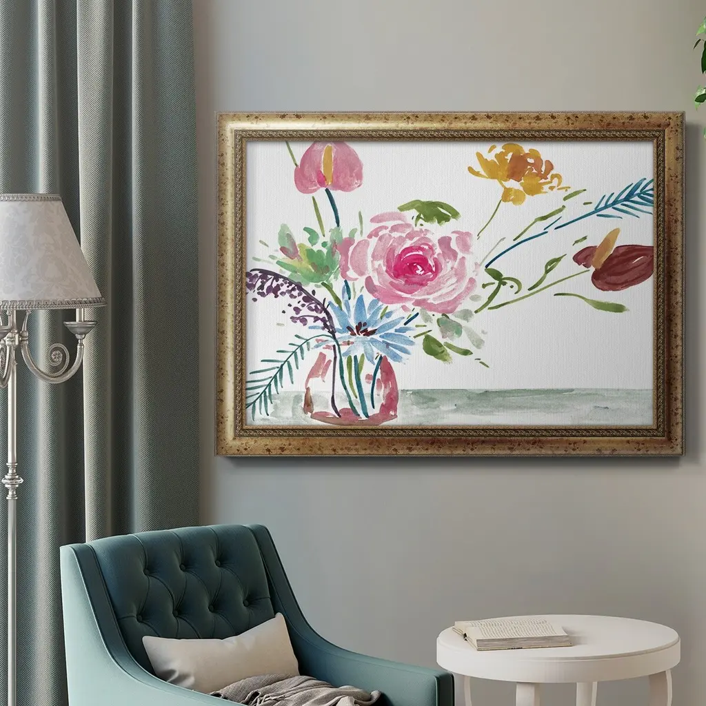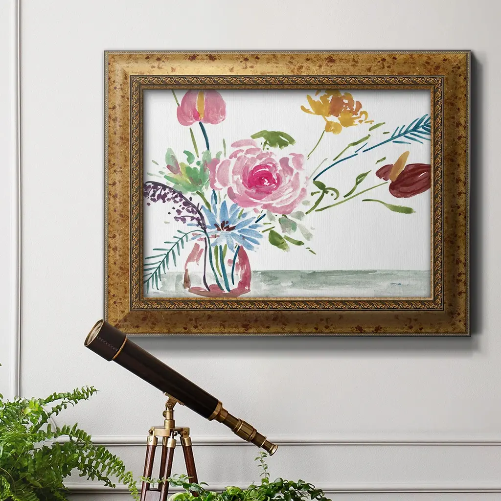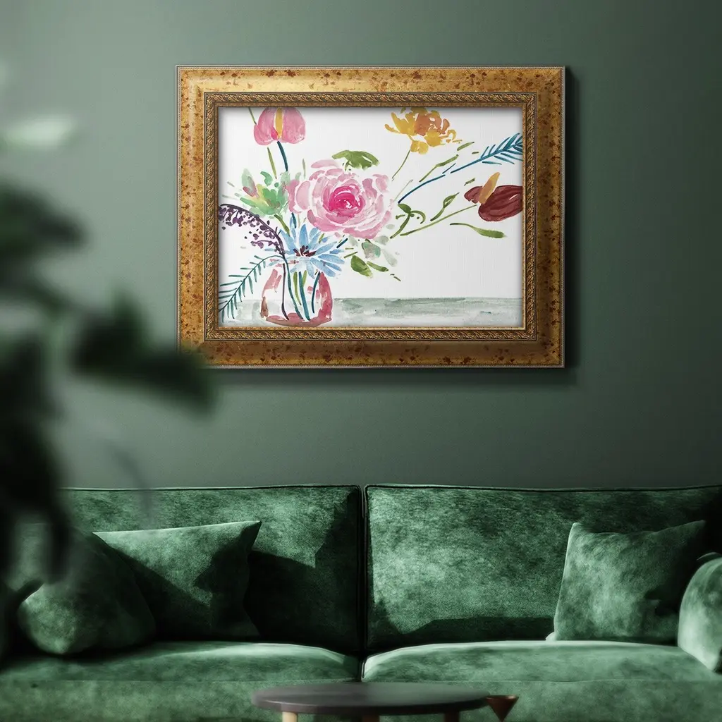Celebration Bouquet I Premium Framed Canvas- Ready to Hang A Premium Framed Canvas created to last. Framed in distressed wood and available in an array of sizes and colors Featuring a beveled a solid wood stretcher bar, each piece comes ready to hand 3 SIZES AVAILABLE 16''X20'' - Overall Size 18'X27'' - Overall Size 24''x36'' - Overall Size Each piece is made to order. Each piece comes with hanging hardware. Made in the USA Ready to Hang Giclee Paper Print Acrylic Glass Beveled Matt Board
