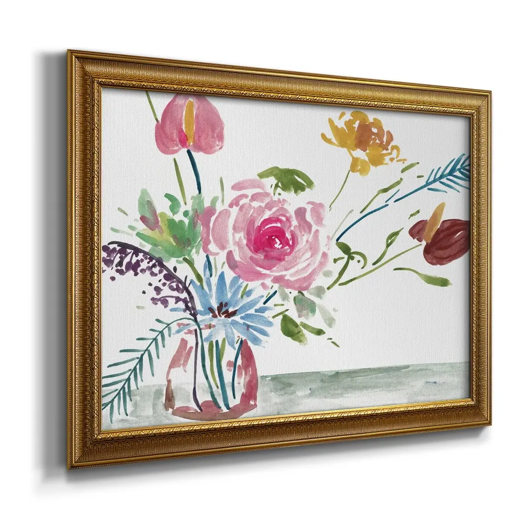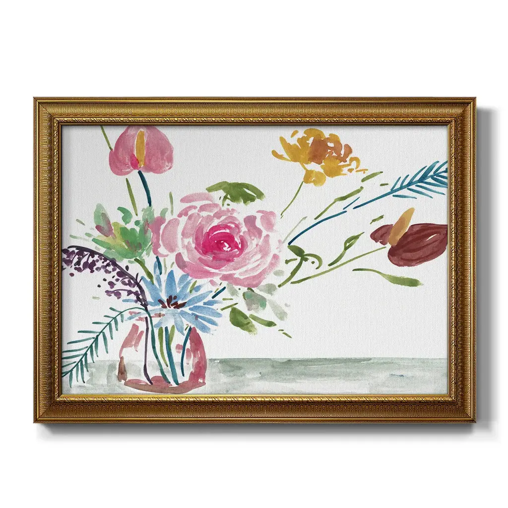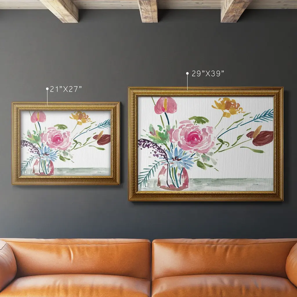 Celebration Bouquet I Premium Framed Canvas- Ready to Hang A Premium Framed Canvas created to last. Framed in distressed wood and available in an array of sizes and colors Featuring a beveled a solid wood stretcher bar, each piece comes ready to hand 3 SIZES AVAILABLE 16''X20'' - Overall Size 18'X27'' - Overall Size 24''x36'' - Overall Size Each piece is made to order. Each piece comes with hanging hardware. Made in the USA Ready to Hang Giclee Paper Print Acrylic Glass Beveled Matt Board
