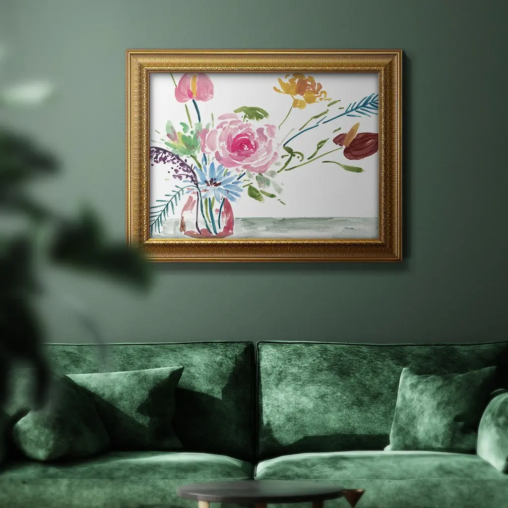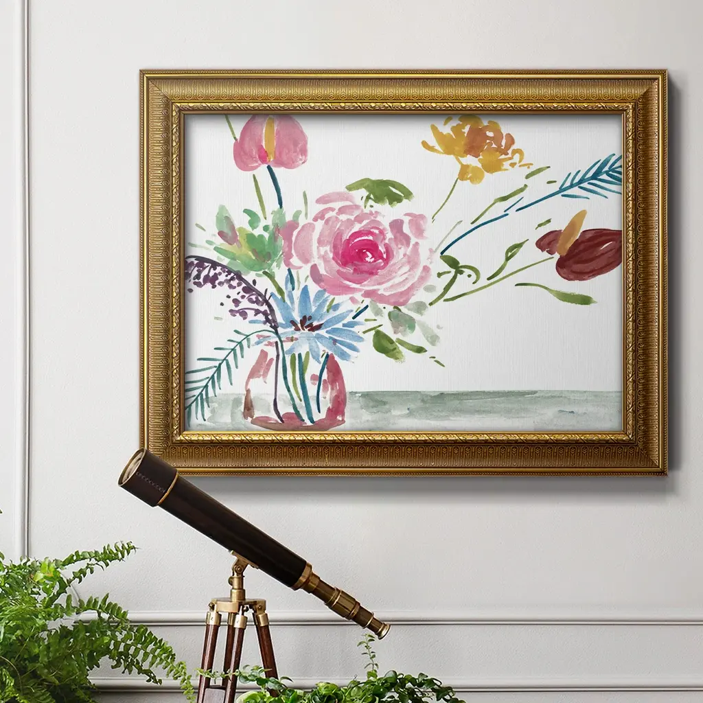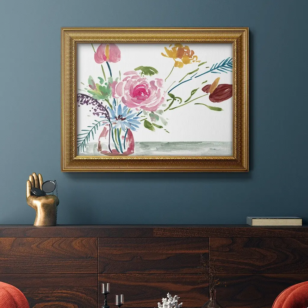 Celebration Bouquet I Premium Framed Canvas- Ready to Hang A Premium Framed Canvas created to last. Framed in distressed wood and available in an array of sizes and colors Featuring a beveled a solid wood stretcher bar, each piece comes ready to hand 3 SIZES AVAILABLE 16''X20'' - Overall Size 18'X27'' - Overall Size 24''x36'' - Overall Size Each piece is made to order. Each piece comes with hanging hardware. Made in the USA Ready to Hang Giclee Paper Print Acrylic Glass Beveled Matt Board