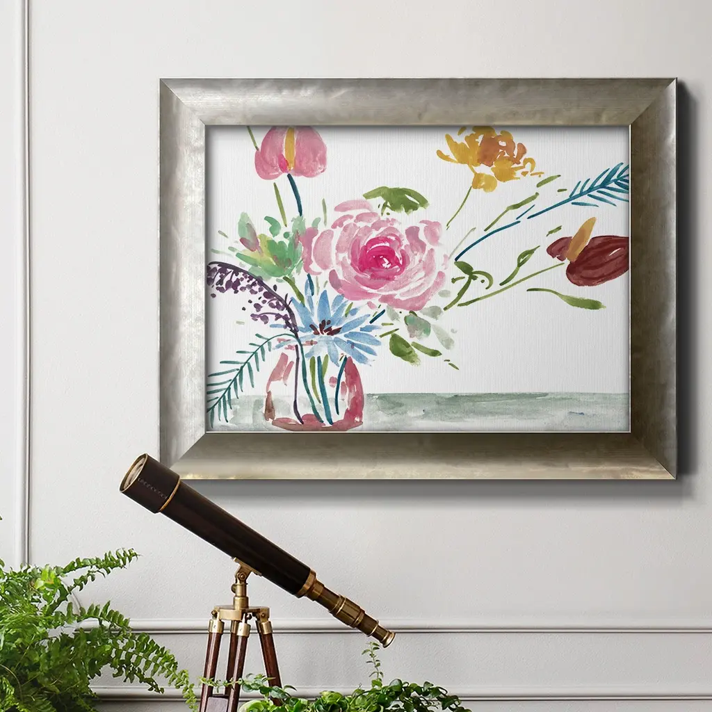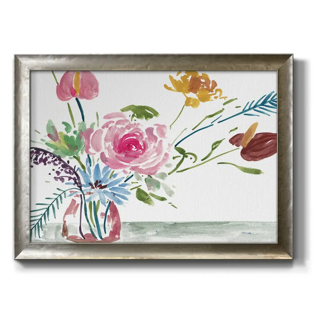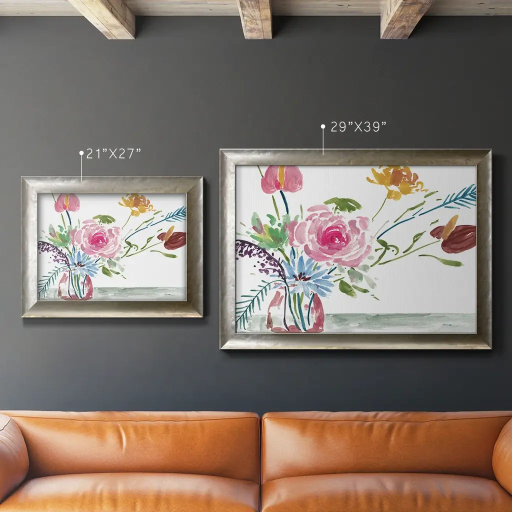Celebration Bouquet I Premium Framed Canvas- Ready to Hang A Premium Framed Canvas created to last. Framed in distressed wood and available in an array of sizes and colors Featuring a beveled a solid wood stretcher bar, each piece comes ready to hand 3 SIZES AVAILABLE 16''X20'' - Overall Size 18'X27'' - Overall Size 24''x36'' - Overall Size Each piece is made to order. Each piece comes with hanging hardware. Made in the USA Ready to Hang Giclee Paper Print Acrylic Glass Beveled Matt Board