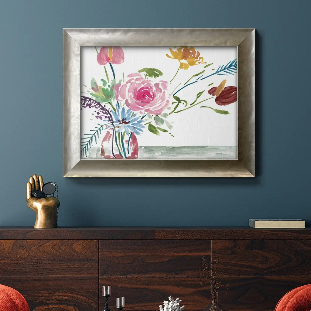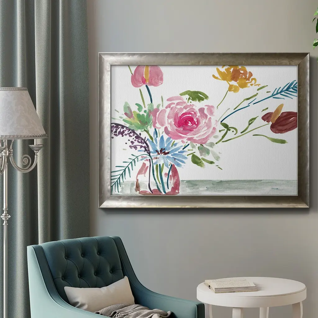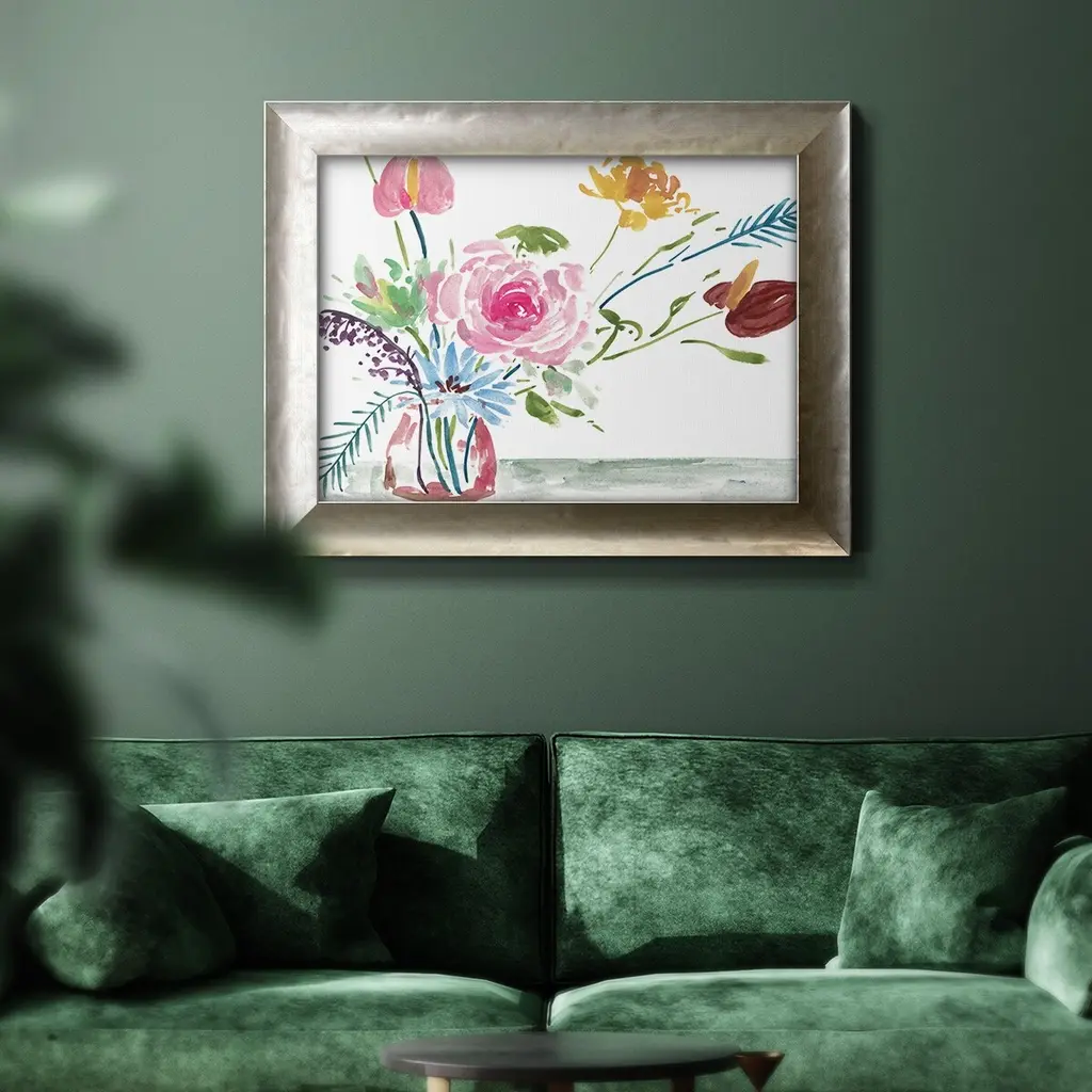 Celebration Bouquet I Premium Framed Canvas- Ready to Hang A Premium Framed Canvas created to last. Framed in distressed wood and available in an array of sizes and colors Featuring a beveled a solid wood stretcher bar, each piece comes ready to hand 3 SIZES AVAILABLE 16''X20'' - Overall Size 18'X27'' - Overall Size 24''x36'' - Overall Size Each piece is made to order. Each piece comes with hanging hardware. Made in the USA Ready to Hang Giclee Paper Print Acrylic Glass Beveled Matt Board