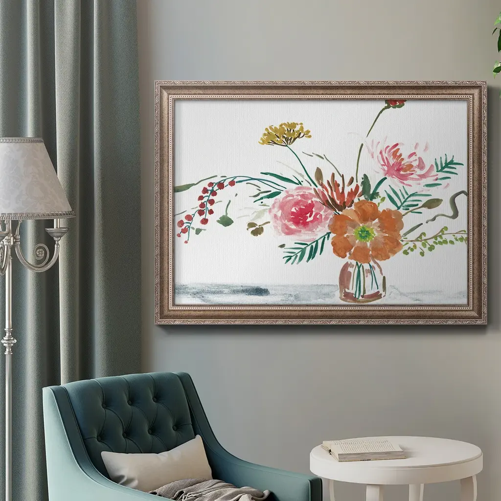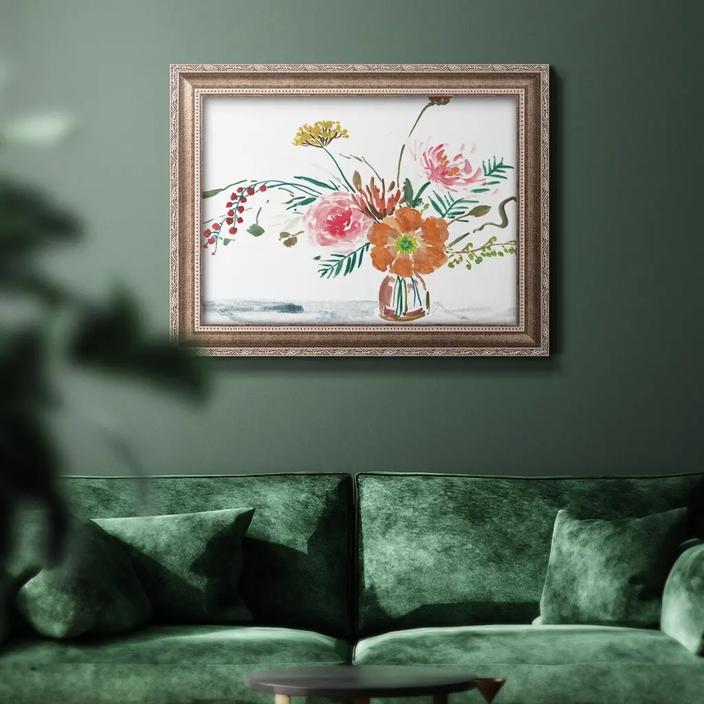 Celebration Bouquet II Premium Framed Canvas- Ready to Hang A Premium Framed Canvas created to last. Framed in distressed wood and available in an array of sizes and colors Featuring a beveled a solid wood stretcher bar, each piece comes ready to hand 3 SIZES AVAILABLE 16''X20'' - Overall Size 18'X27'' - Overall Size 24''x36'' - Overall Size Each piece is made to order. Each piece comes with hanging hardware. Made in the USA Ready to Hang Giclee Paper Print Acrylic Glass Beveled Matt Board