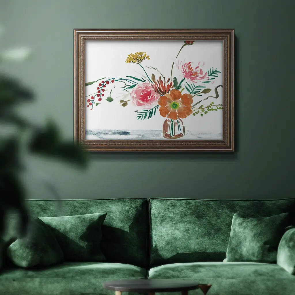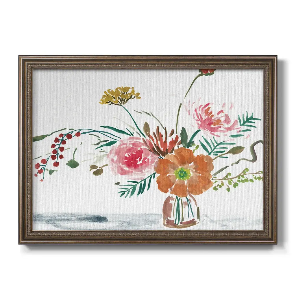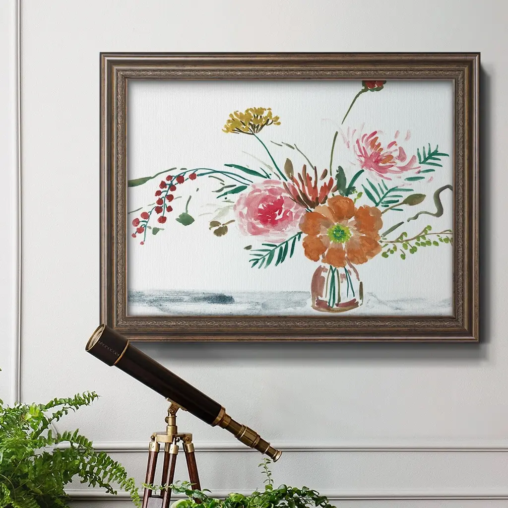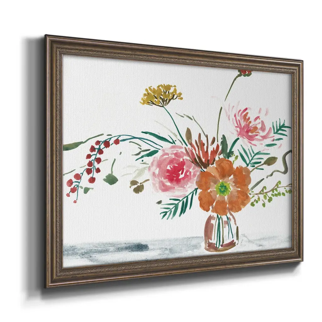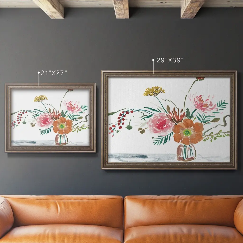 Celebration Bouquet II Premium Framed Canvas- Ready to Hang A Premium Framed Canvas created to last. Framed in distressed wood and available in an array of sizes and colors Featuring a beveled a solid wood stretcher bar, each piece comes ready to hand 3 SIZES AVAILABLE 16''X20'' - Overall Size 18'X27'' - Overall Size 24''x36'' - Overall Size Each piece is made to order. Each piece comes with hanging hardware. Made in the USA Ready to Hang Giclee Paper Print Acrylic Glass Beveled Matt Board