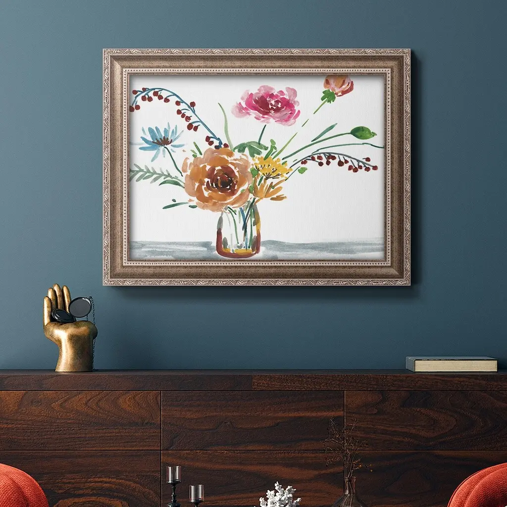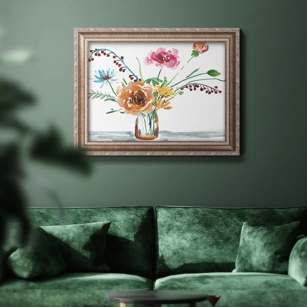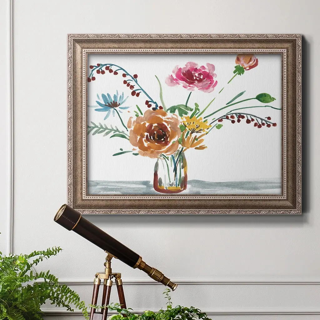 Celebration Bouquet III Premium Framed Canvas- Ready to Hang A Premium Framed Canvas created to last. Framed in distressed wood and available in an array of sizes and colors Featuring a beveled a solid wood stretcher bar, each piece comes ready to hand 3 SIZES AVAILABLE 16''X20'' - Overall Size 18'X27'' - Overall Size 24''x36'' - Overall Size Each piece is made to order. Each piece comes with hanging hardware. Made in the USA Ready to Hang Giclee Paper Print Acrylic Glass Beveled Matt Board