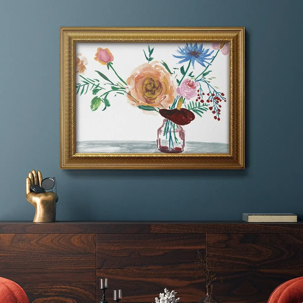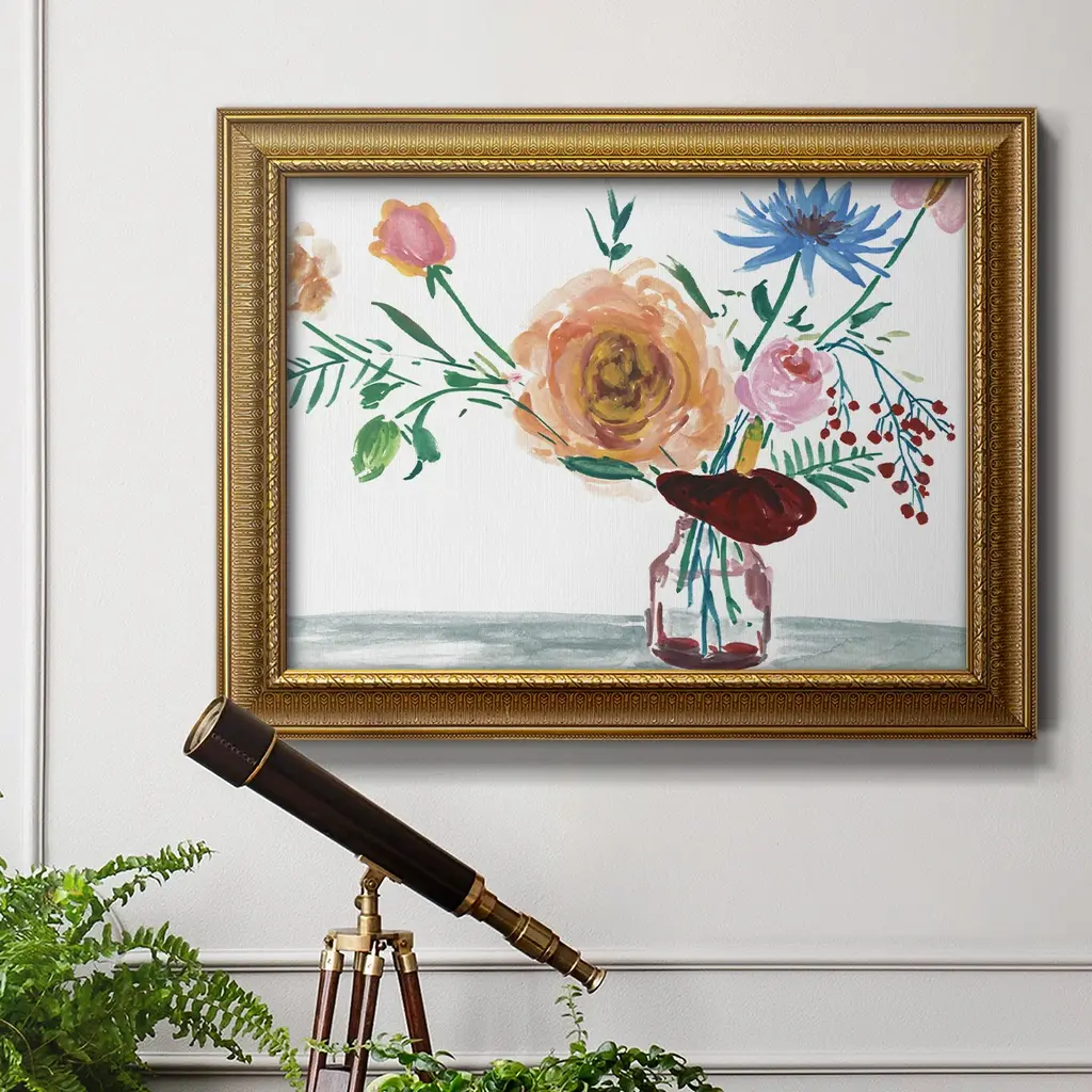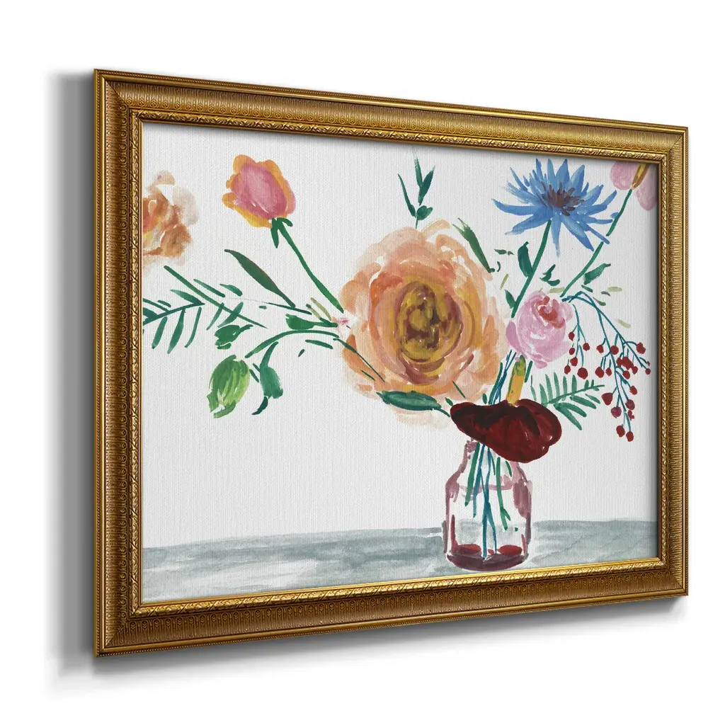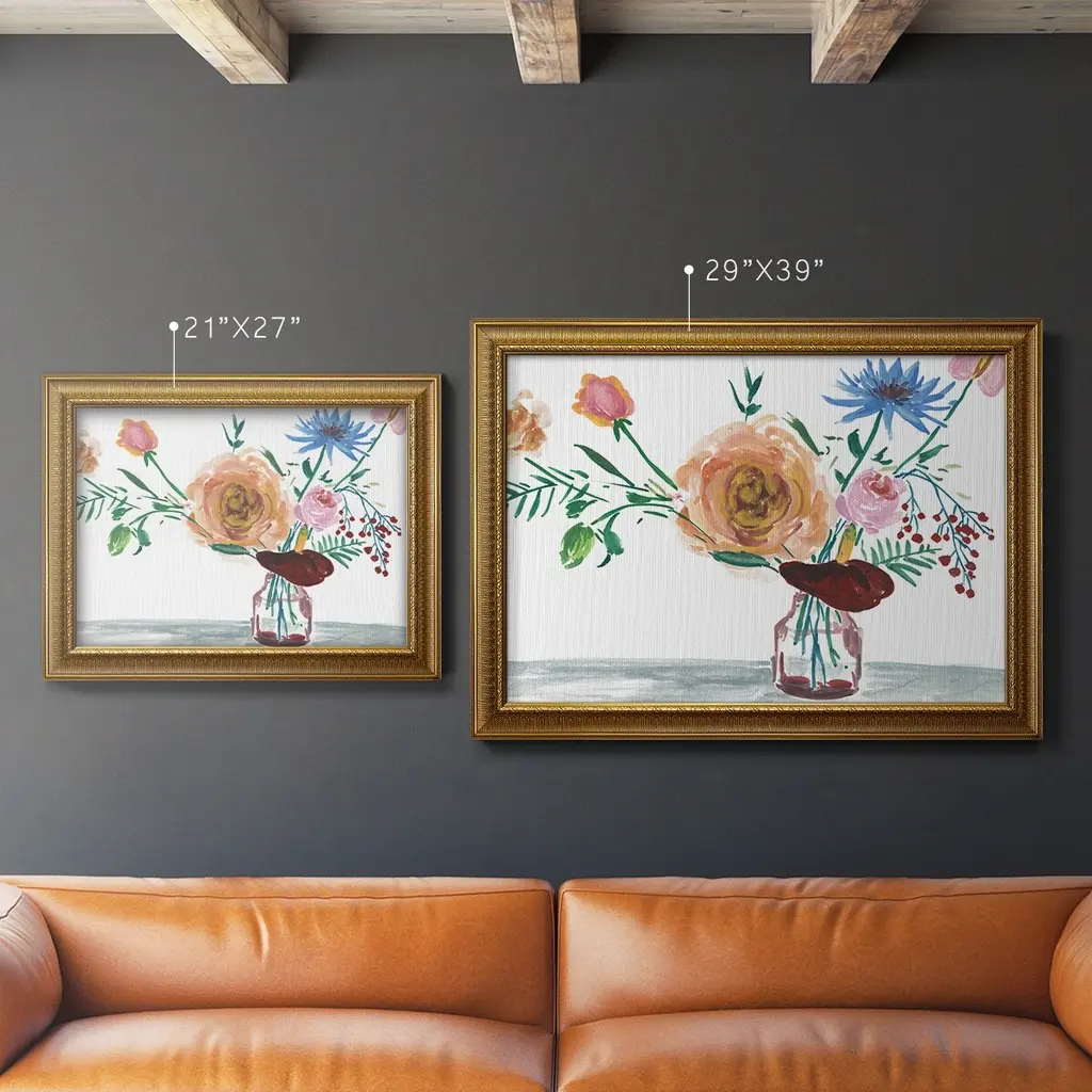 Celebration Bouquet IV Premium Framed Canvas- Ready to Hang A Premium Framed Canvas created to last. Framed in distressed wood and available in an array of sizes and colors Featuring a beveled a solid wood stretcher bar, each piece comes ready to hand 3 SIZES AVAILABLE 16''X20'' - Overall Size 18'X27'' - Overall Size 24''x36'' - Overall Size Each piece is made to order. Each piece comes with hanging hardware. Made in the USA Ready to Hang Giclee Paper Print Acrylic Glass Beveled Matt Board