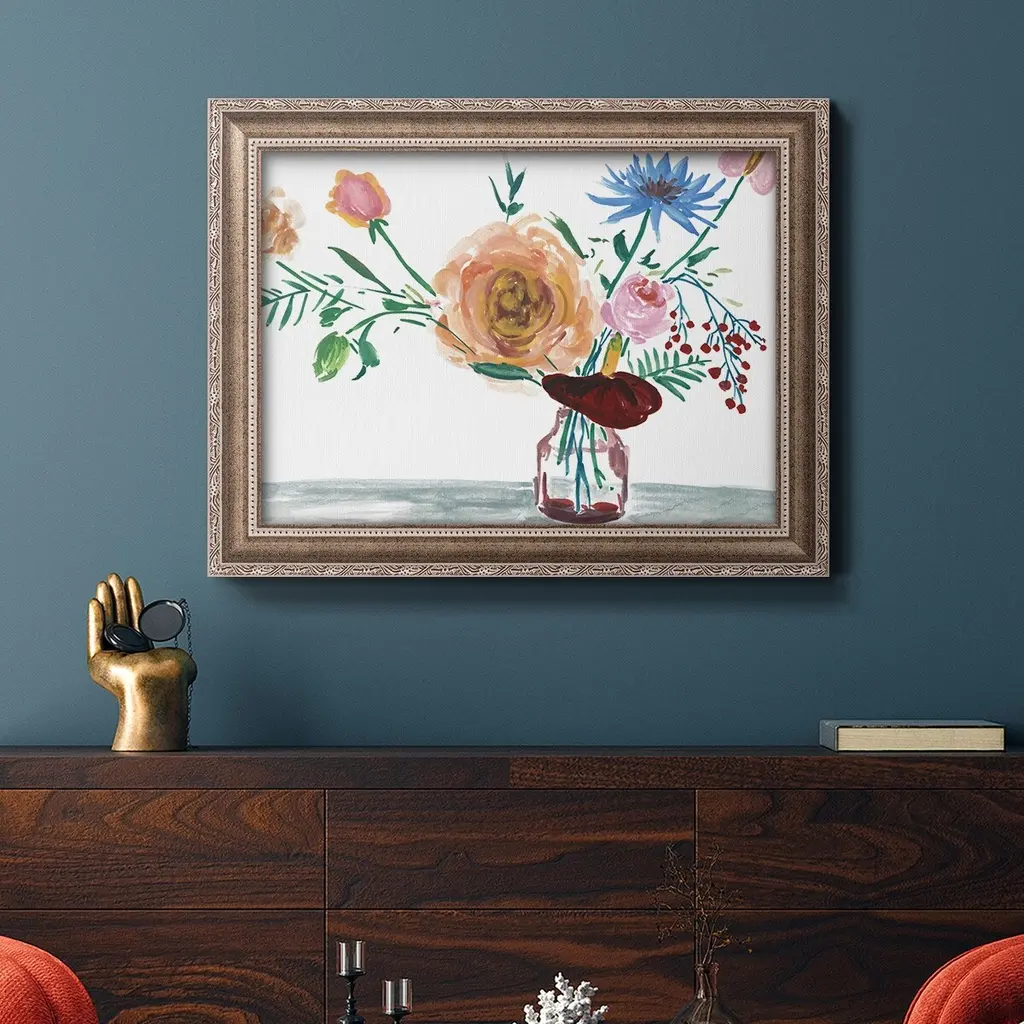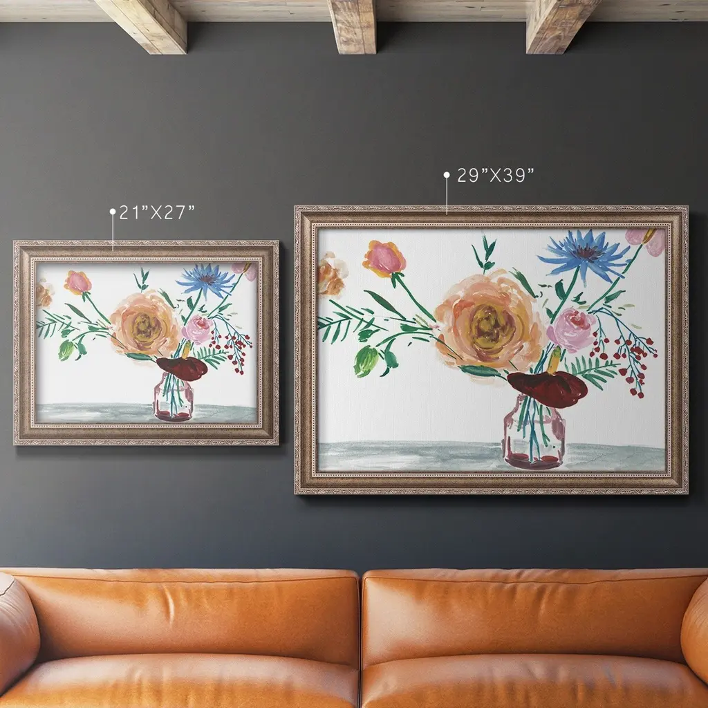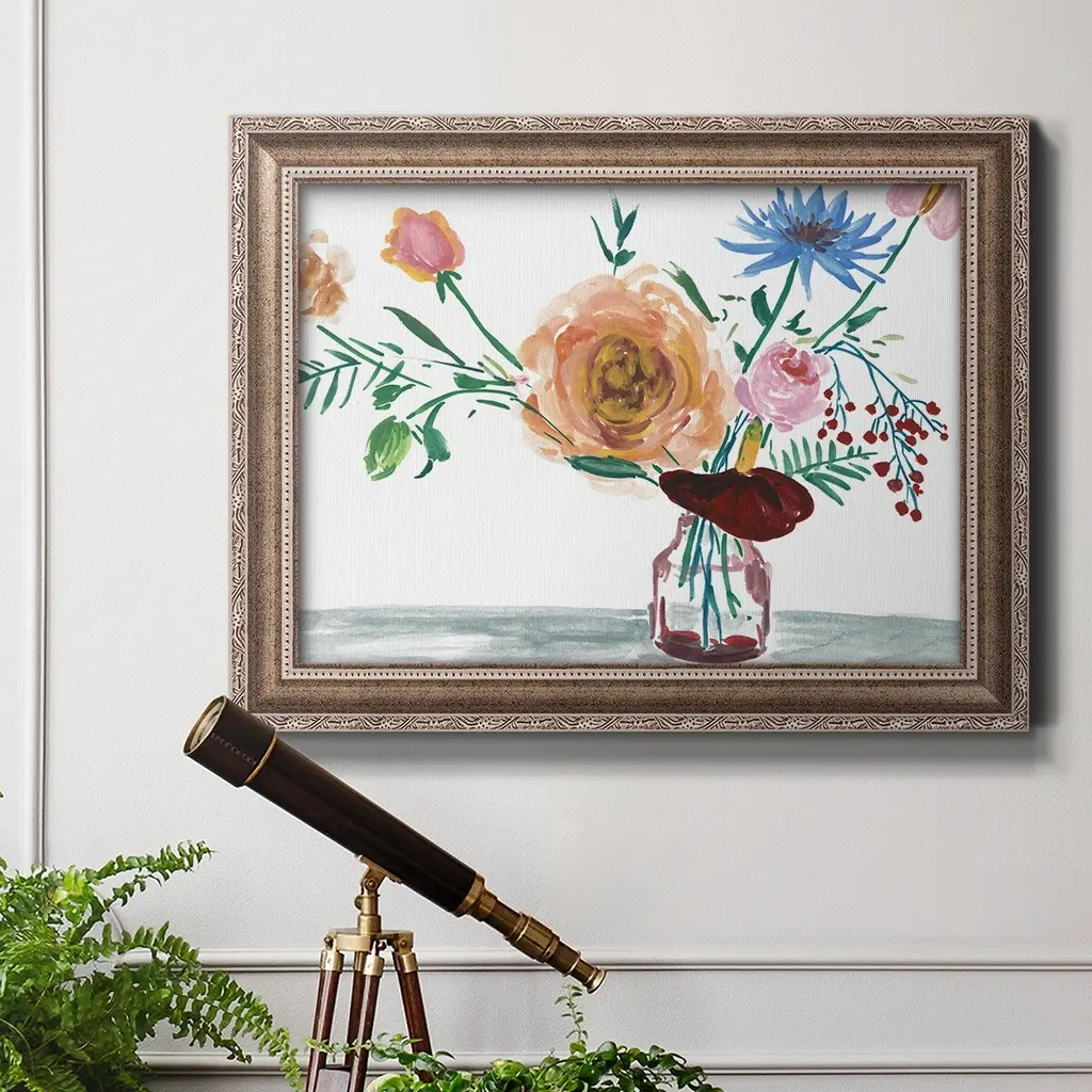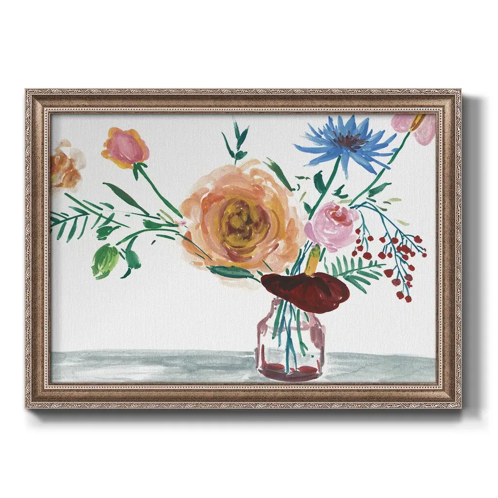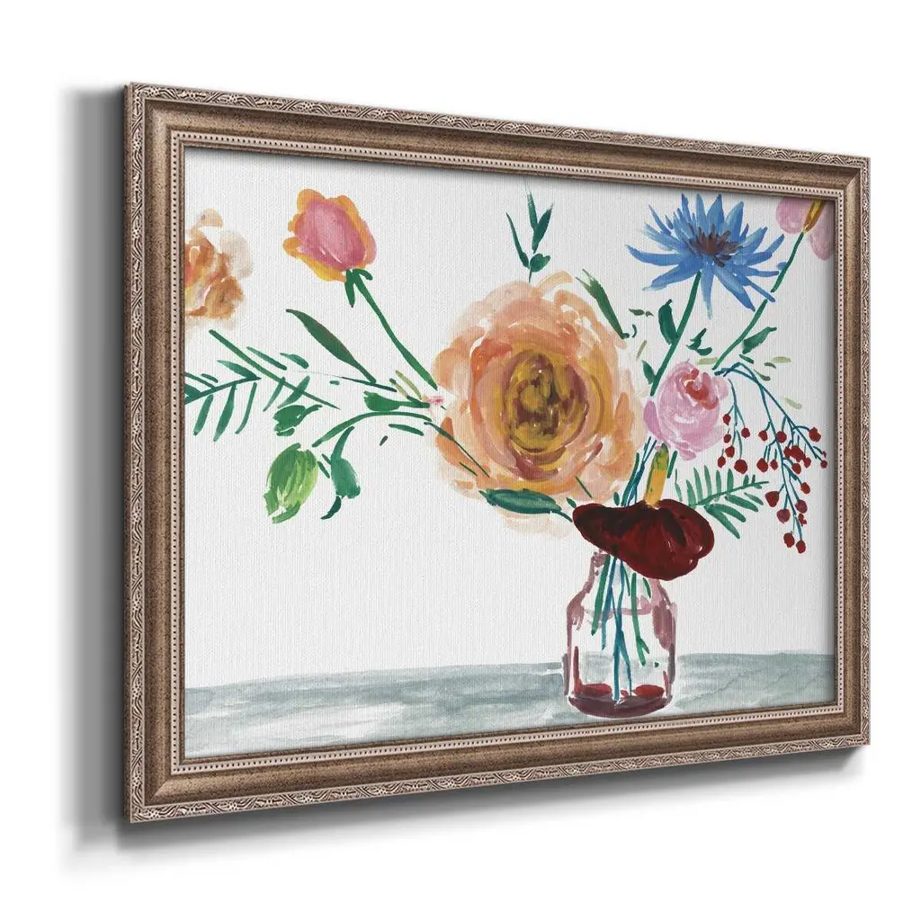 Celebration Bouquet IV Premium Framed Canvas- Ready to Hang A Premium Framed Canvas created to last. Framed in distressed wood and available in an array of sizes and colors Featuring a beveled a solid wood stretcher bar, each piece comes ready to hand 3 SIZES AVAILABLE 16''X20'' - Overall Size 18'X27'' - Overall Size 24''x36'' - Overall Size Each piece is made to order. Each piece comes with hanging hardware. Made in the USA Ready to Hang Giclee Paper Print Acrylic Glass Beveled Matt Board